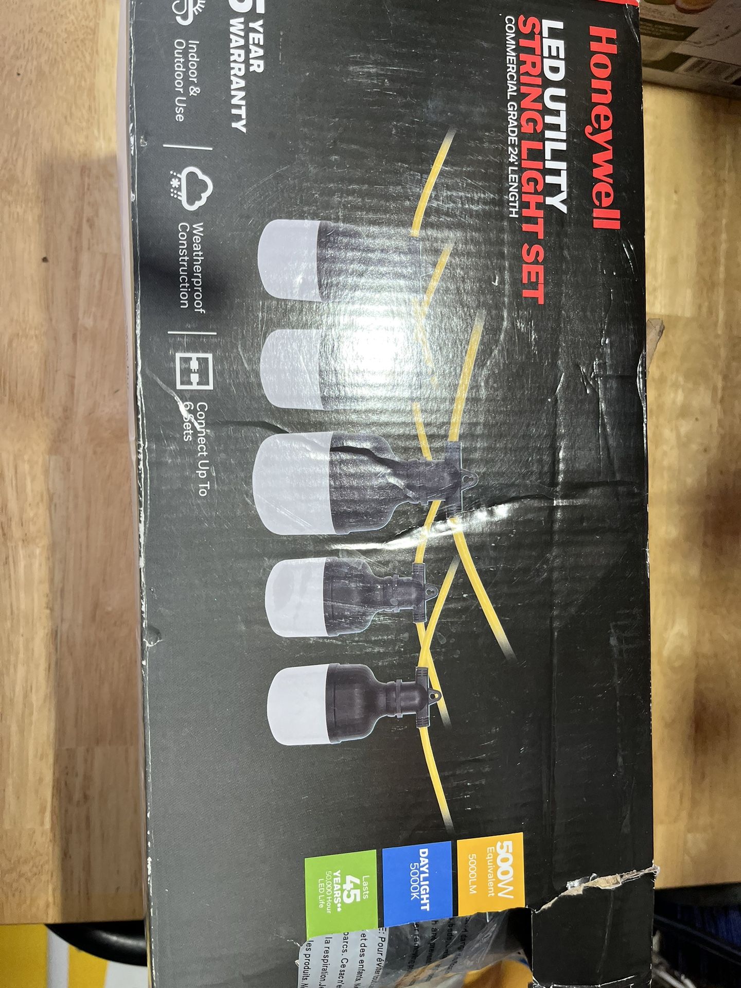 5 bulb bright 5000Lumen utility string light Indoor and outdoor use.Weatherproof construction.Impact resistant durable rugged plastic.E26 base.24foot long with 56.3 inch spacing between bulbs provides greater light coverage.3 prong linkable cord. *Item is brand new I’ve only opened it to connect it to power.The box is a little beat up.