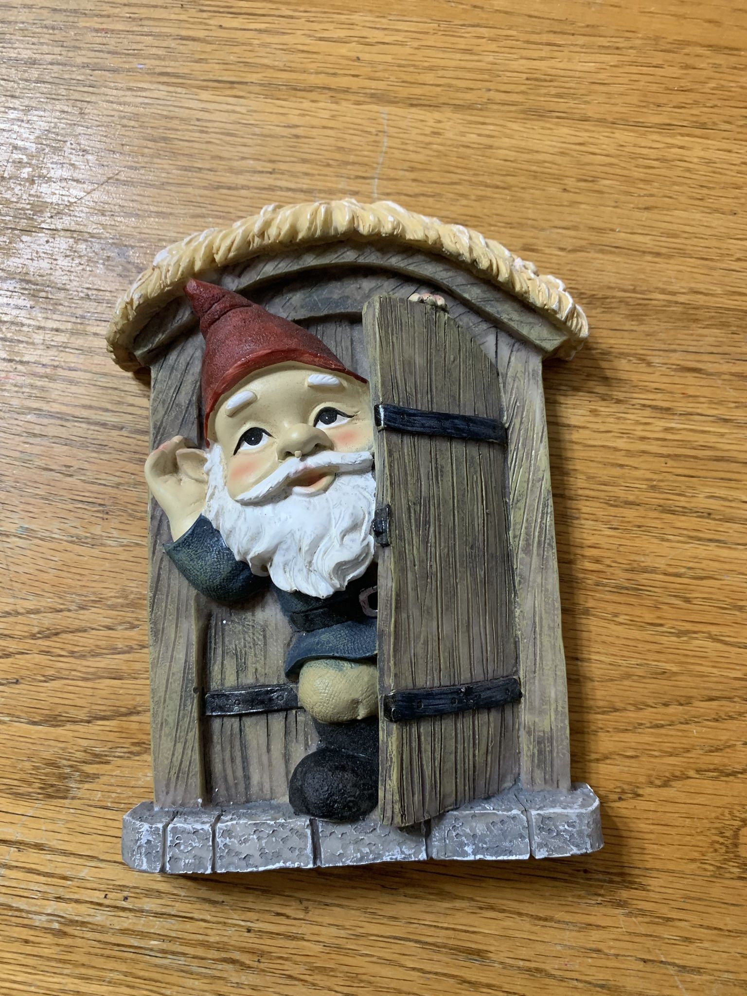 Yard decor. Small Gnome coming out a door. Made to go on a tree. 8 inches tall, 6 inches wide