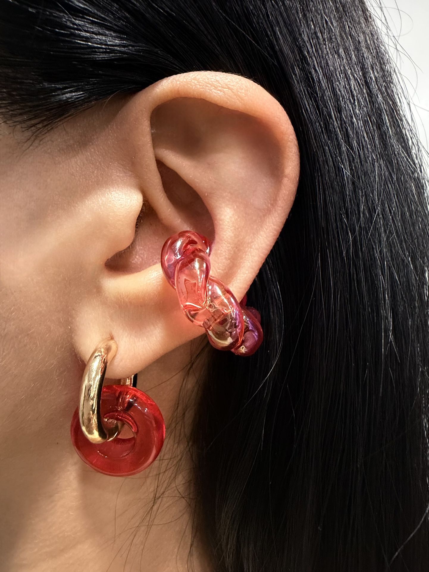 Beautiful medium sized circular hoop huggies. The red, orange & lilac are acrylic (perfect for beachy or summery vibes). All colors pictured above available, the earcuff & ring are available too. Just ask me 🥰