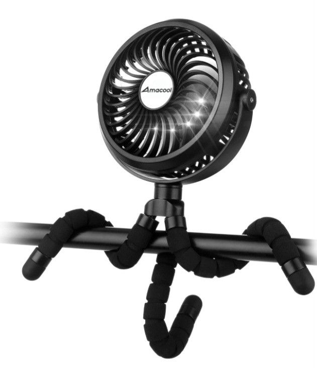 New AMACOOL Battery Operated Stroller Fan Flexible Tripod Clip On Fan with 3 Speeds and Rotatable Handheld Personal Fans for Car Seat Crib Bike Treadmill (Black). Features & Details Brand AMACOOL Color Black Electric fan design Table Fan Power SourceBattery Powered Style Modern Product Dimensions 2.5"D x 5.4"W x 11"H Design for Baby: the mini fan with a flexible tripod/Legs, versatile and easy to clip on most strollers, crib, wheelchair, carriage and etc in any position, it’s a lifesaver for car seat, especially those with rear facing, your kid and you can enjoy cool and comfortable ride; For all-round 360° cooling, we highly recommended pairing AMACOOL Baby Stroller Cooling Pad ( ASIN: B0FCG4DR5J) with this stroller fan, instantly soothes baby’s discomfort while on the go, from daily walks to outdoor adventures 360 Degree Angled and 3 Speeds: the stroller fan's head can adjust vertically and horizontally for any direction,to create the perfect cooling breeze; it comes with 3 speeds for different purpose, powerful wind yet whisper working Rechargeable and Portable: built-in 2600mah non-replaceable battery, lasts 2.5-10 hours depending on winds, support USB charging via laptop and any power source with USB output.