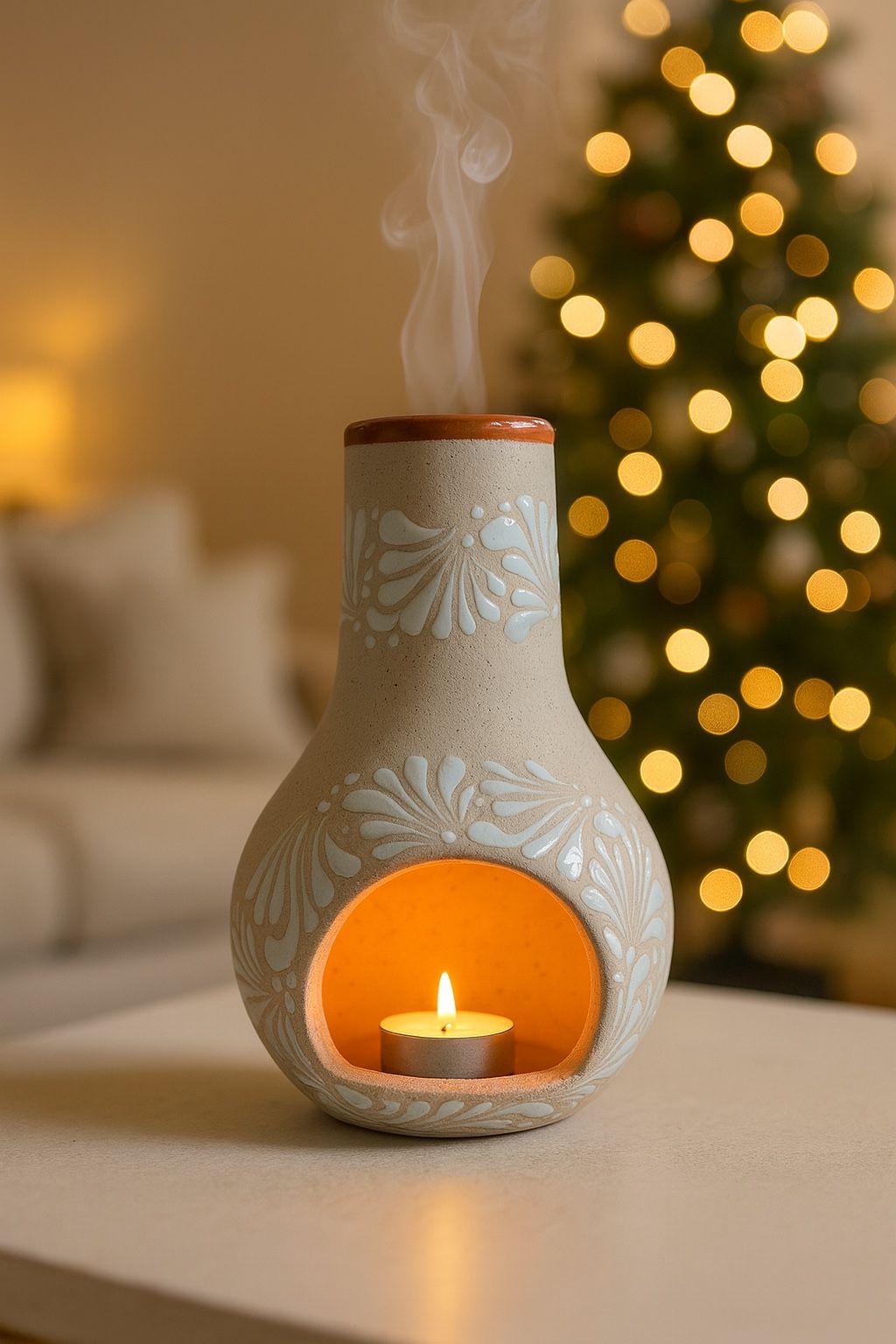 This beautiful handcrafted chimney decoration adds warmth and charm to any living space. Designed with delicate hand-painted detailing, it features an open chamber perfect for placing a small candle inside, creating a soft and inviting glow. Light smoke gently releases through the top, enhancing its cozy and decorative appeal. Styled in a living room setting with a softly blurred Christmas tree in the background, this piece brings festive elegance and artisanal beauty to your home décor. Each piece is 100% lead free, ensuring safe, high-quality craftsmanship you can trust. At Luz del Alma, we take pride in offering pieces that not only elevate your décor but also deliver exceptional care, attention, and service to our clients—your satisfaction is always at the heart of what we do. ⚠️ Each piece is uniquely handmade Variations in color, brush strokes, and pattern details are natural and celebrated characteristics of artisan-crafted Talavera pieces.