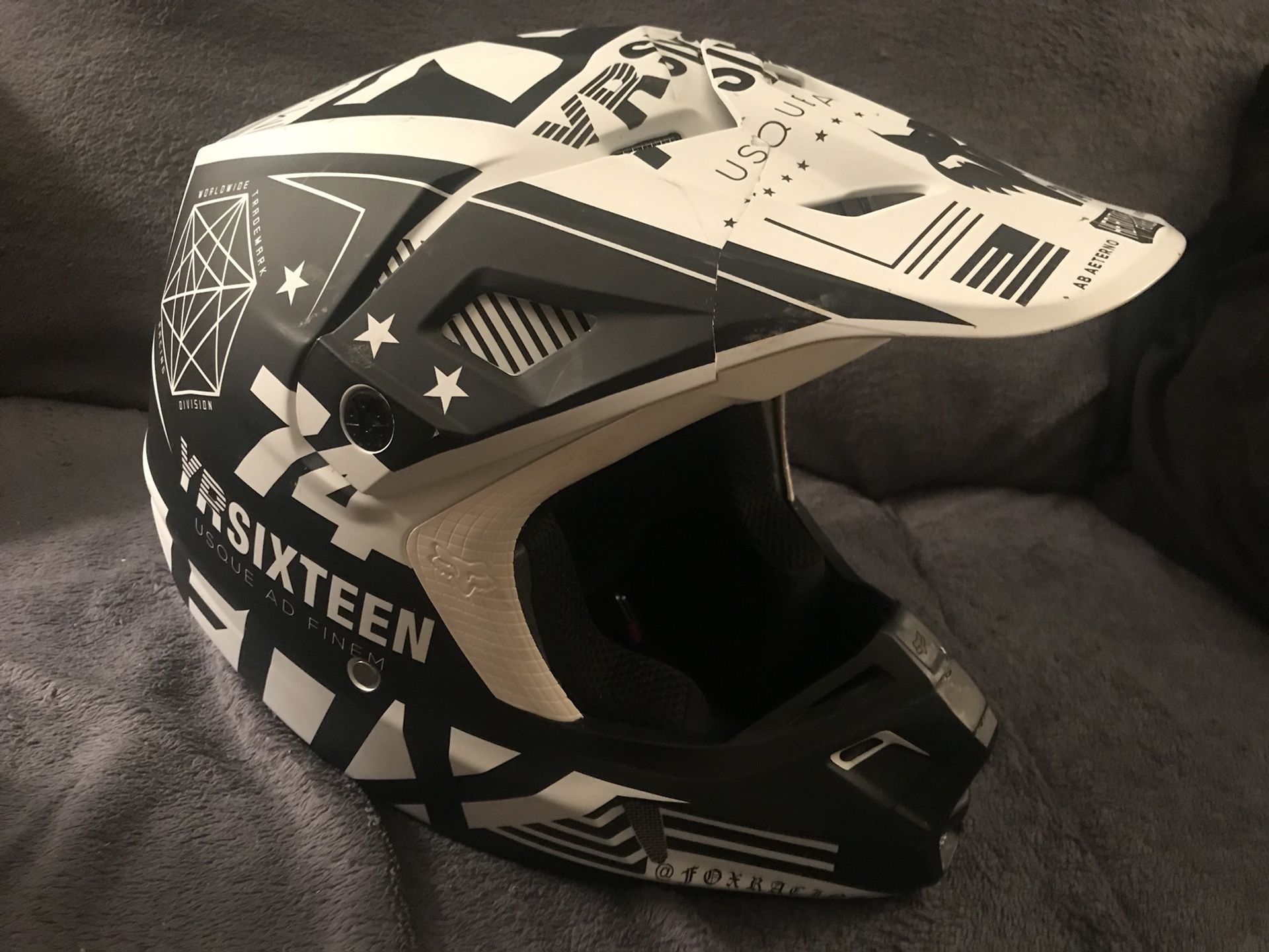 Cracked on the visor but bad! Only used twice !!! Size Medium! Googles come with it!