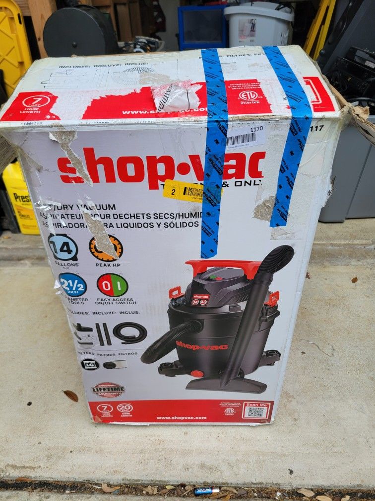 New Shop Vac Wet/Dry Vacuum 14 Gallons 6 HP Never Used. Comes with Filter, Caster Wheels, 2 Attachments. It does NOT have the extensions for the hose is only things missing.