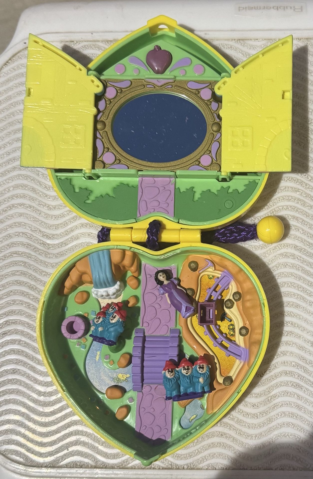 The product is a vintage plastic play set featuring the characters from the fairy tale "Snow White and the Seven Dwarfs." Made by the brand Prime Time and originating from China, this complete set includes all the beloved characters from the story. With a yellow heart design, this nostalgic toy is perfect for fans of classic Disney tales and collectors of vintage toys.