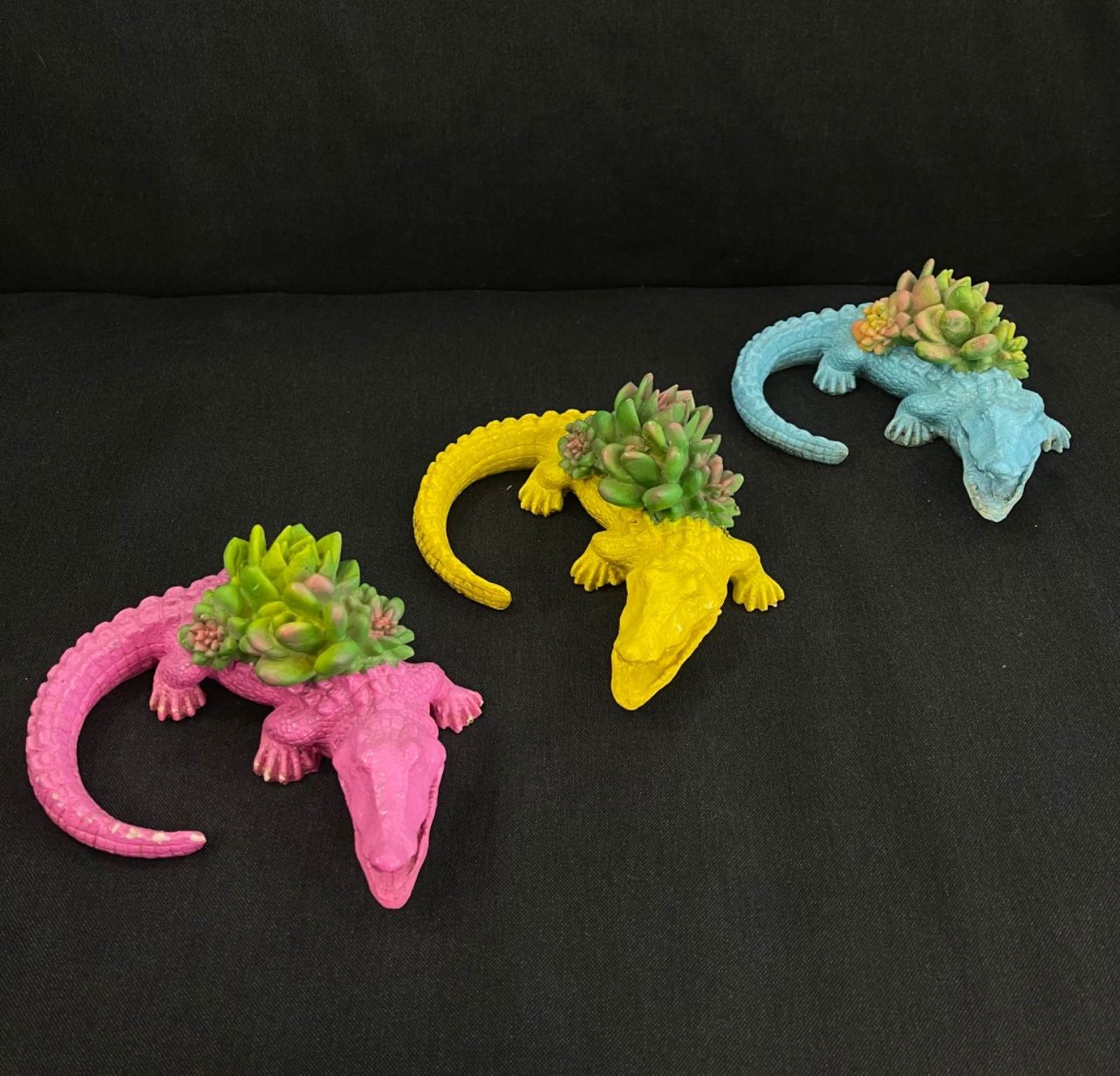 3 poly resin plaster Alligator Succulent Garden statues. Pink, yellow, blue.