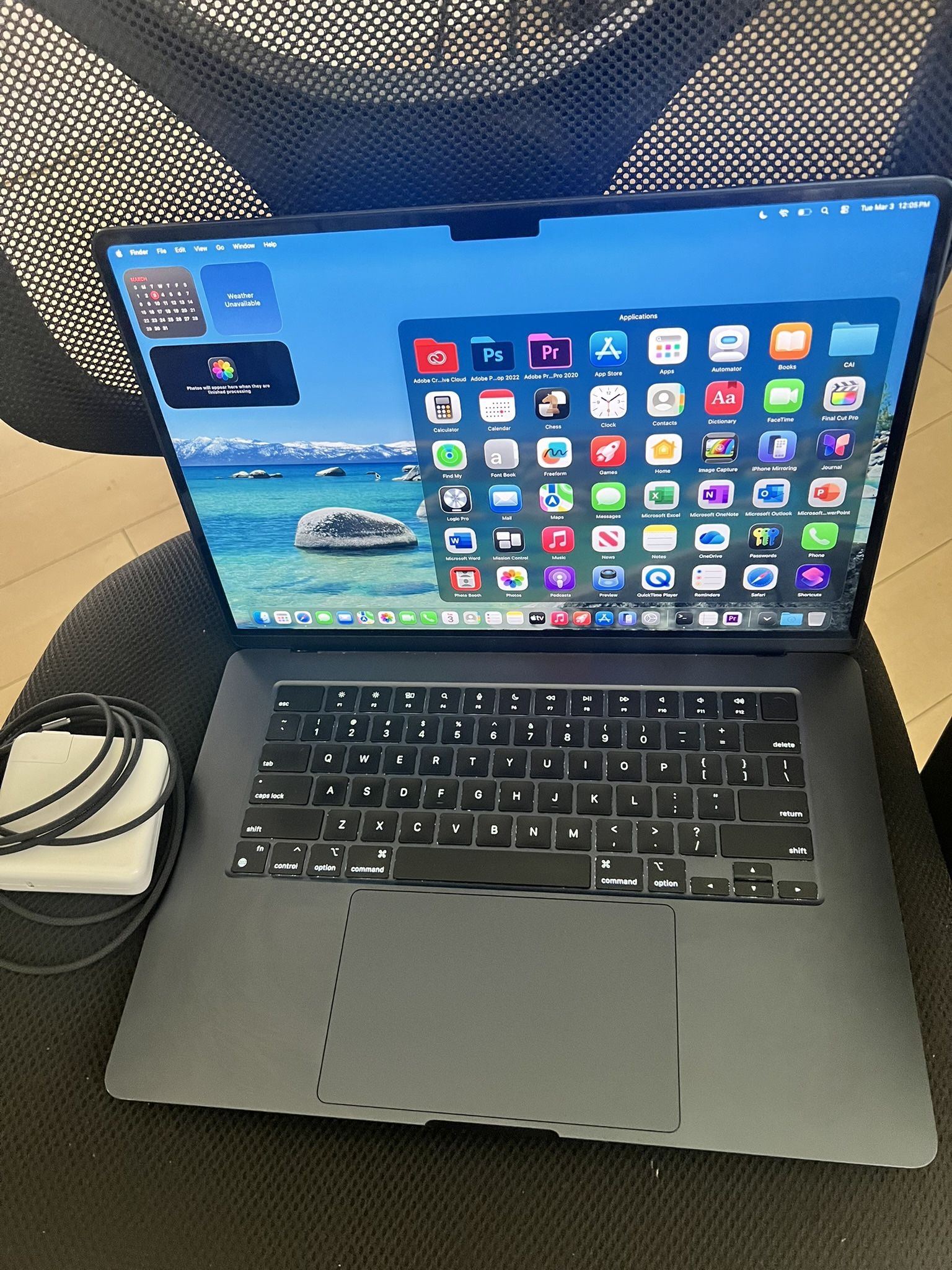 Selling an excellent condition 15 Inch MacBook Air loaded with program apps. Final Cut 12, Logic Pro 12, Photoshop, Premiere and Office 15 inch MacBook Air M2, 8GB, 256GB Includes Apple Charger It’s excellent like new condition and everything works 100%. Battery last all day You are welcome to test it before purchasing. $750 Cash Only Meet at coffee shop for transaction. No meeting at gas stations No meeting at residential No meeting in parking lots No shipping
