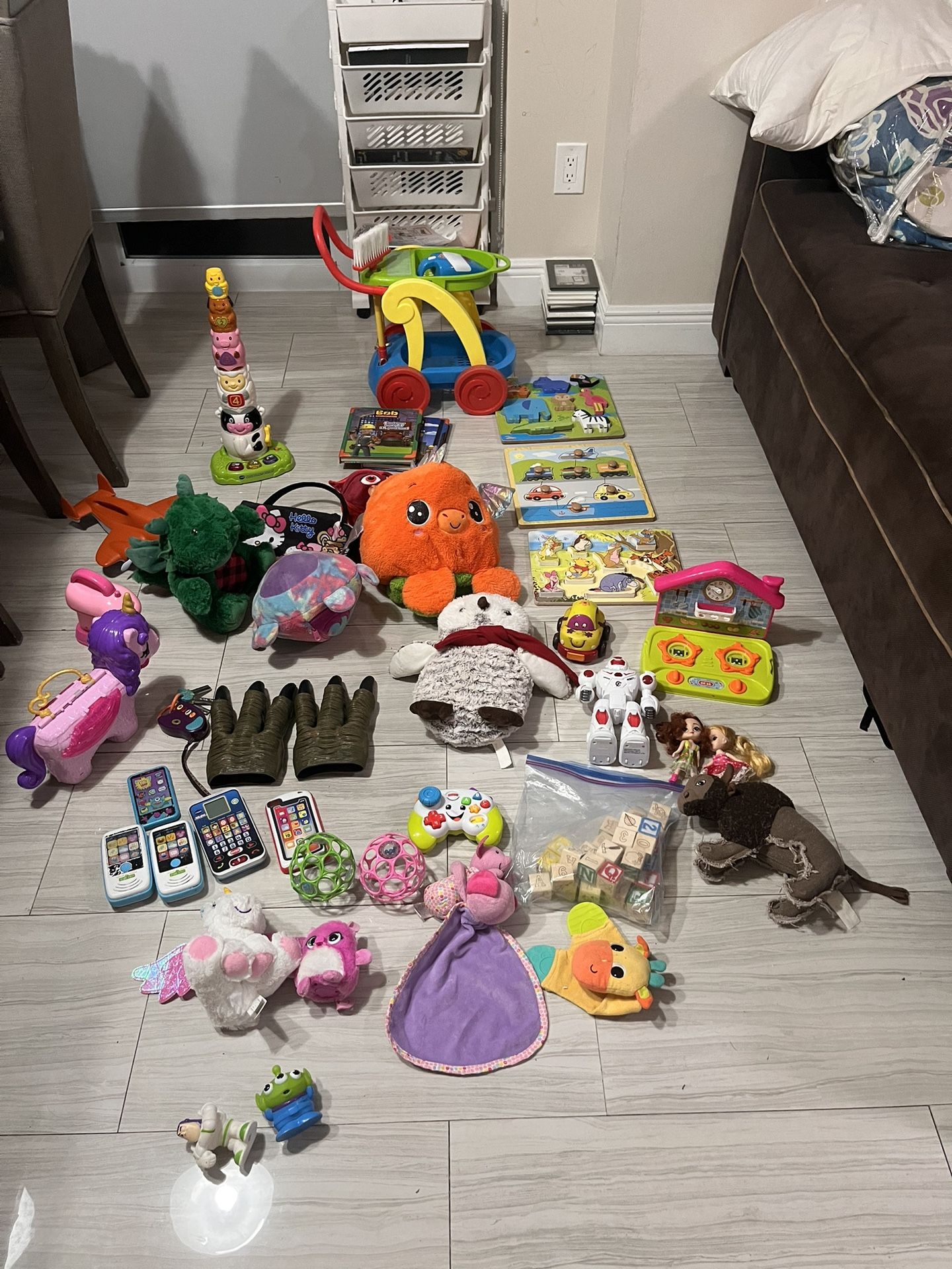 Please read below for details: Puzzles: $3 each Hello Kitty purse: $3 Dinosaur claws: $5 Bob the build books (new) in Spanish:$3 each Fisher price farm animal tower with sounds: $3 Wooden letter cubes (like new): $3 Soft toys $1 Unicorn storage purse: $3.