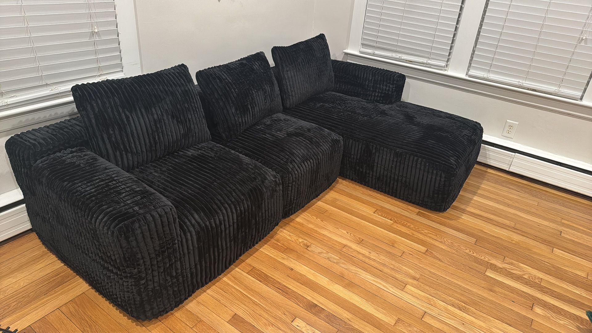 Black, 3 piece sectional, perfect condition 110 inches long R facing chaisse Curdory fabric- soft and very easy to clean/vacuum Had for a little less than a month need a bigger piece