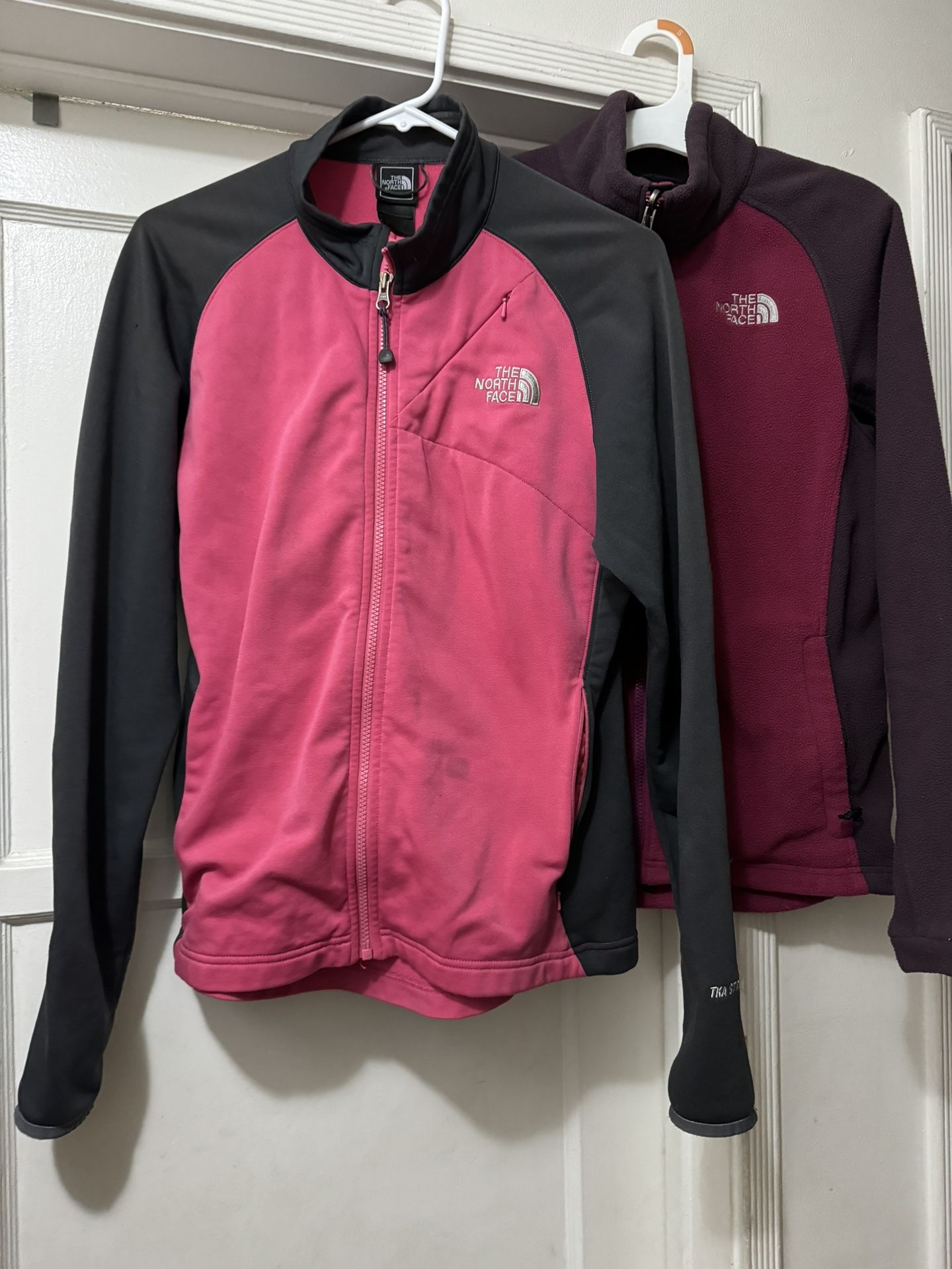 The North Face women’s fleece jackets…. These has some minor flaws as you can see in pics but barely noticeable… one has a tiny little hole and the other a small scrape line as seen in pic….. still in good condition both are size M … they retail over $120 each … Asking $40 for both!!!! Pick up North Long Beach