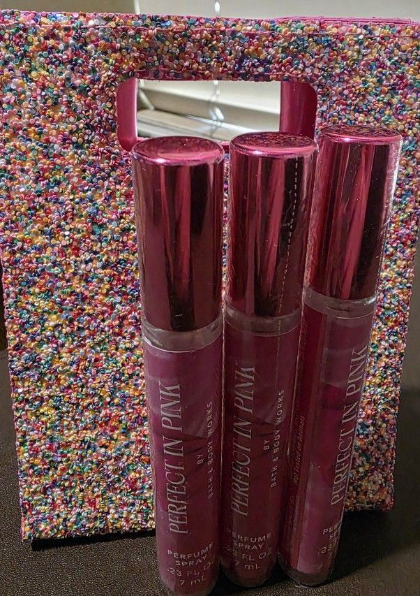 New with tags, never been used. The price is for 3 Bath & Body Works Perfect in Pink Mini Perfume Sprays and a free Bath & Body Works Glitter Pink Reusable Mini Gift Bag. • Fragrance notes: vibrant cherries, pink camellia, and whipped almond crème. Gives you a powerful, long-lasting fragrance experience. • Higher concentration of fragrance oils •Made to be displayed on your vanity, counter, shelf...or anywhere really Dermatologist tested