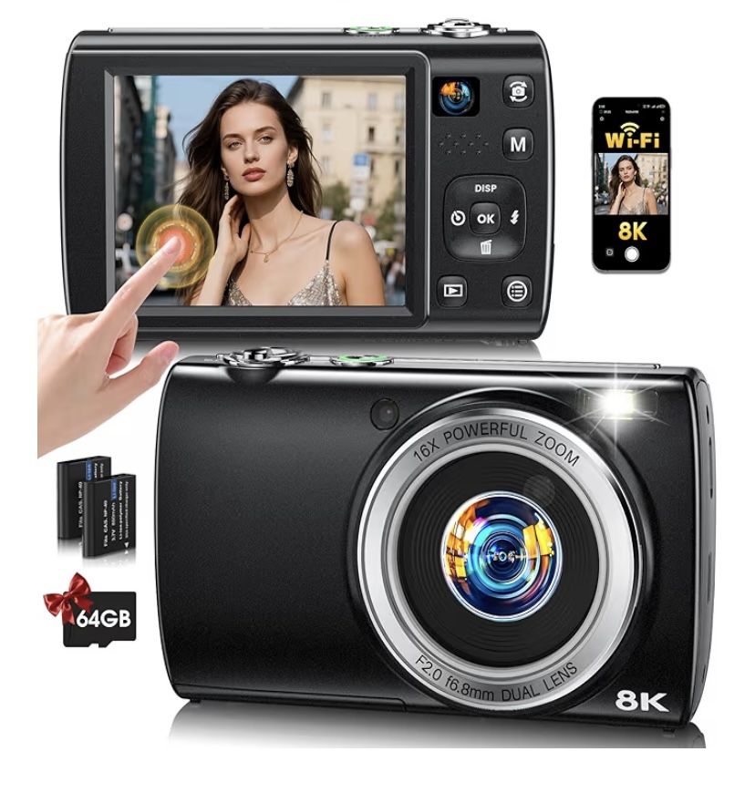 Dual Cameras & 8K Ultra HD】——This 8K digital camera features a front and rear dual-camera system, delivering ultra-clear video up to 8K (7680×4320, 15FPS) and high-resolution photos up to 88MP (interpolated). Designed as a versatile digital camera for photography, it’s ideal for selfies, vlogging, and everyday shooting. 【Autofocus & 5-Axis Anti-Shake】——Enjoy fast, accurate autofocus that keeps your subject sharp in every scene. Combined with electronic 5-Axis anti-shake stabilization, this point and shoot digital camera produces steady, clear photos and videos — perfect for travel, family moments, and creators on the move. 【2.8" IPS Touch Screen & WiFi Sharing】——The 2.8-inch IPS HD touch screen offers vivid colors and wide viewing angles for easy framing and playback. Supporting 4:3, 16:9, and 1:1 aspect ratios, this vlogging camera for YouTube adapts seamlessly to social media posts, landscapes, and portraits. Built-in WiFi allows quick wireless transfer, letting you preview, share, and upload content instantly without cables. 【16X Digital Zoom & Creative Modes】——Capture distant details with 16X digital zoom and explore multiple shooting modes, including timer, burst, interval, slow motion, loop recording, and time-lapse. Easy to use yet powerful, this digital camera for teens and beginners makes creative photography simple and fun.