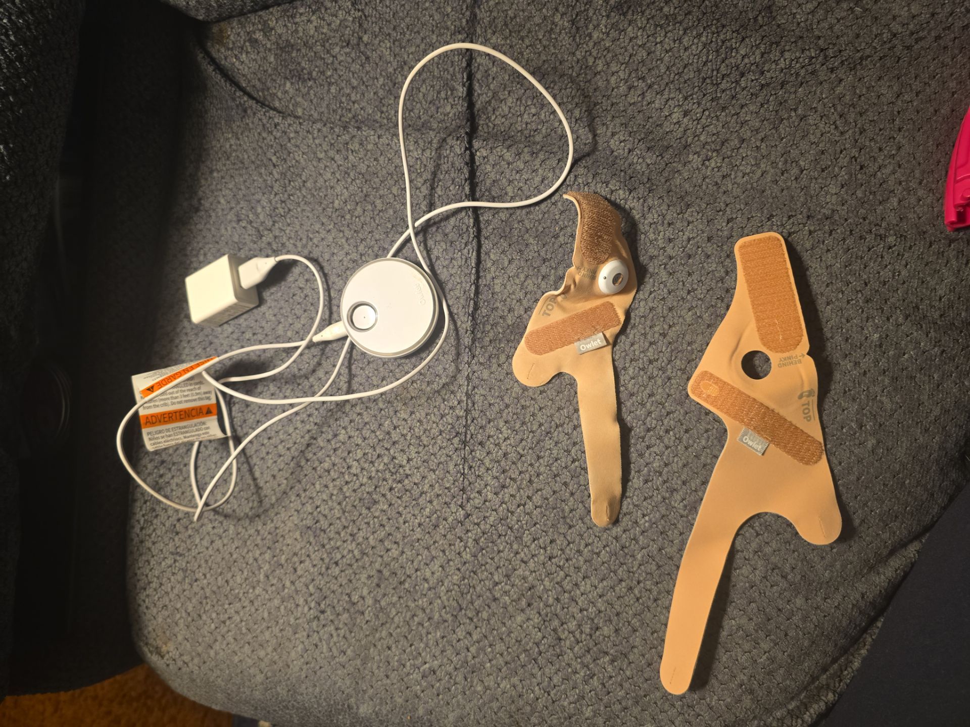 Owlet dream sock receiver with charger, two socks (small and large) and sensor used to monitor baby's breathing and heart rate. The receiver alarms when baby stops breathing or has low oxygen saturation. SIDS prevention. We bought this an anxious new parents but immedaitely realized our smart crib has an infared camera that interferes with the signal from the sock to the receiver. We chose to use the same crib instead of the sock so it is not really used. All you do is download the owlet app and it will direct you how to pair the sock.