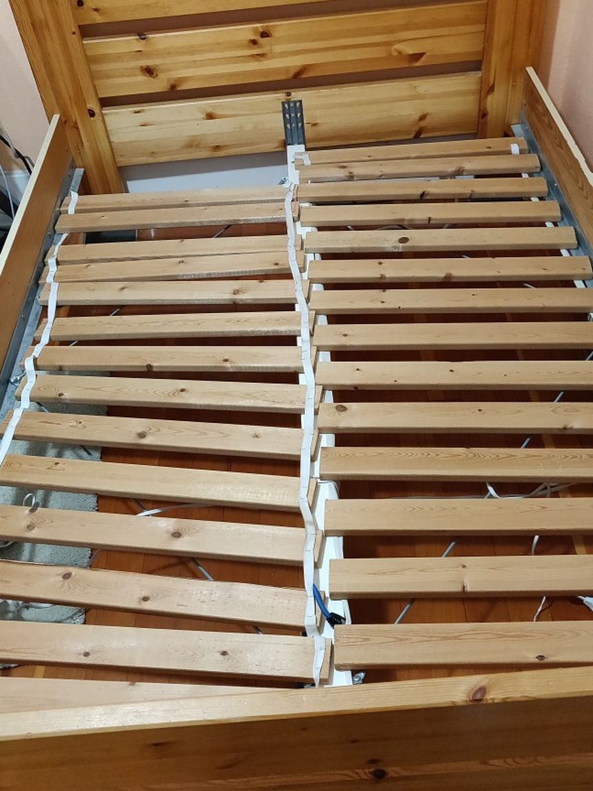 Complete wood/metal bed frame. Perfect for a kid. It is 56.5 inch wide and 67.5 inch long.