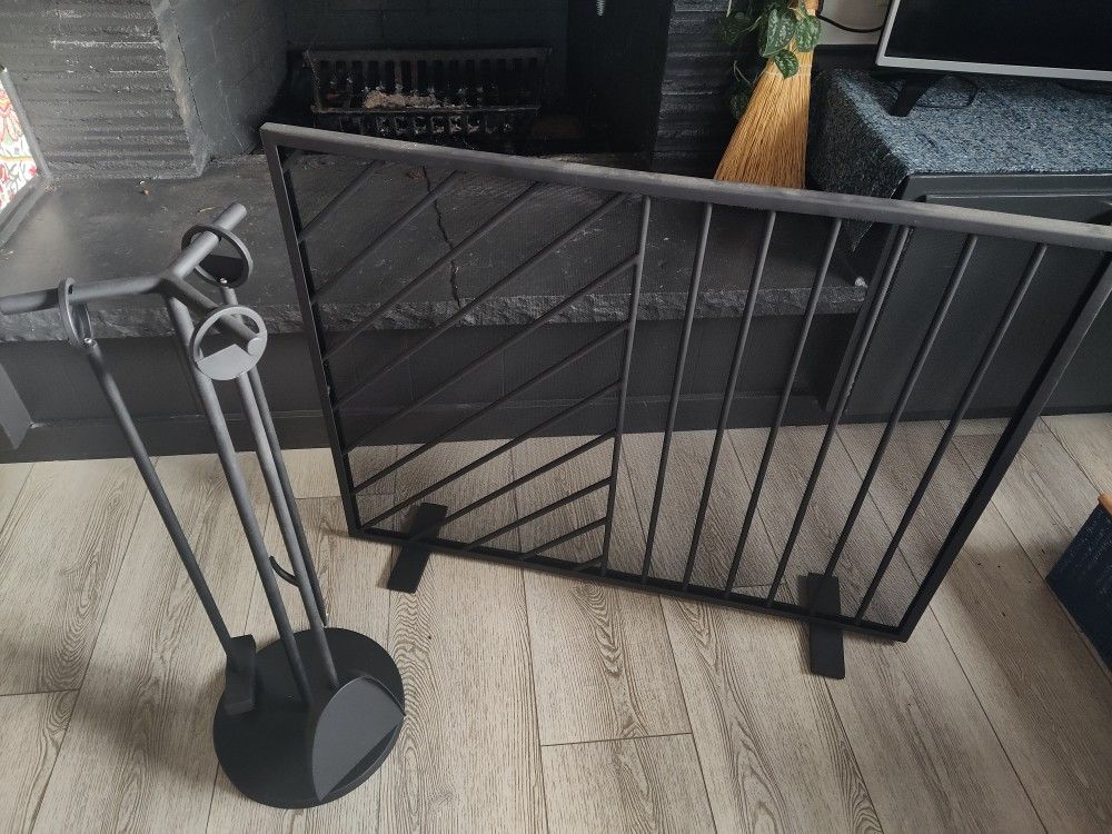 Only used a few times - installing gas fireplace so don't need. West elm matte black fireplace screen 30 x 38 wide $40 West elm matte black 3 piece tool set with stand $40