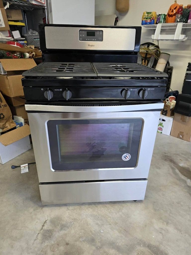Selling a used Whirlpool gas range, model WFG515S0ES1, in very good overall condition. This unit was removed during a remodel and has been tested and is fully functional. Details Brand: Whirlpool Model: WFG515S0ES1 Fuel: Natural Gas Power: 120V / 60Hz Cooktop: 5 burners Includes Power Burner and AccuSimmer Oven: Large capacity with self-clean Finish: Stainless steel front with black sides Storage drawer included Made in USA (Assembled in USA per label) Condition All burners, oven, and controls work as expected Clean interior and exterior Normal light cosmetic wear from use ⚠️ Important Disclosure (Please Read): There is a slight bend on the bottom right corner of the front panel (see photos). This is cosmetic only and does not affect operation, sealing, or safety. Included Stove only (no gas line included) Original paperwork found in drawer (see photo) Pickup only from storage off Corn pass and TV highway.