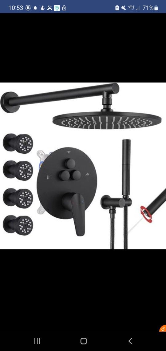 New in Box - Shower Faucet Set Matte Black Shower System, Push Button Diverter Shower Faucet with 2 in 1 Handheld,10 Inch Shower Head with 4 PCS Two Modes Body Jets(Rough-in Valve Body and Trim Included) - New in box, never used. Did not fit for our shower plumbing.