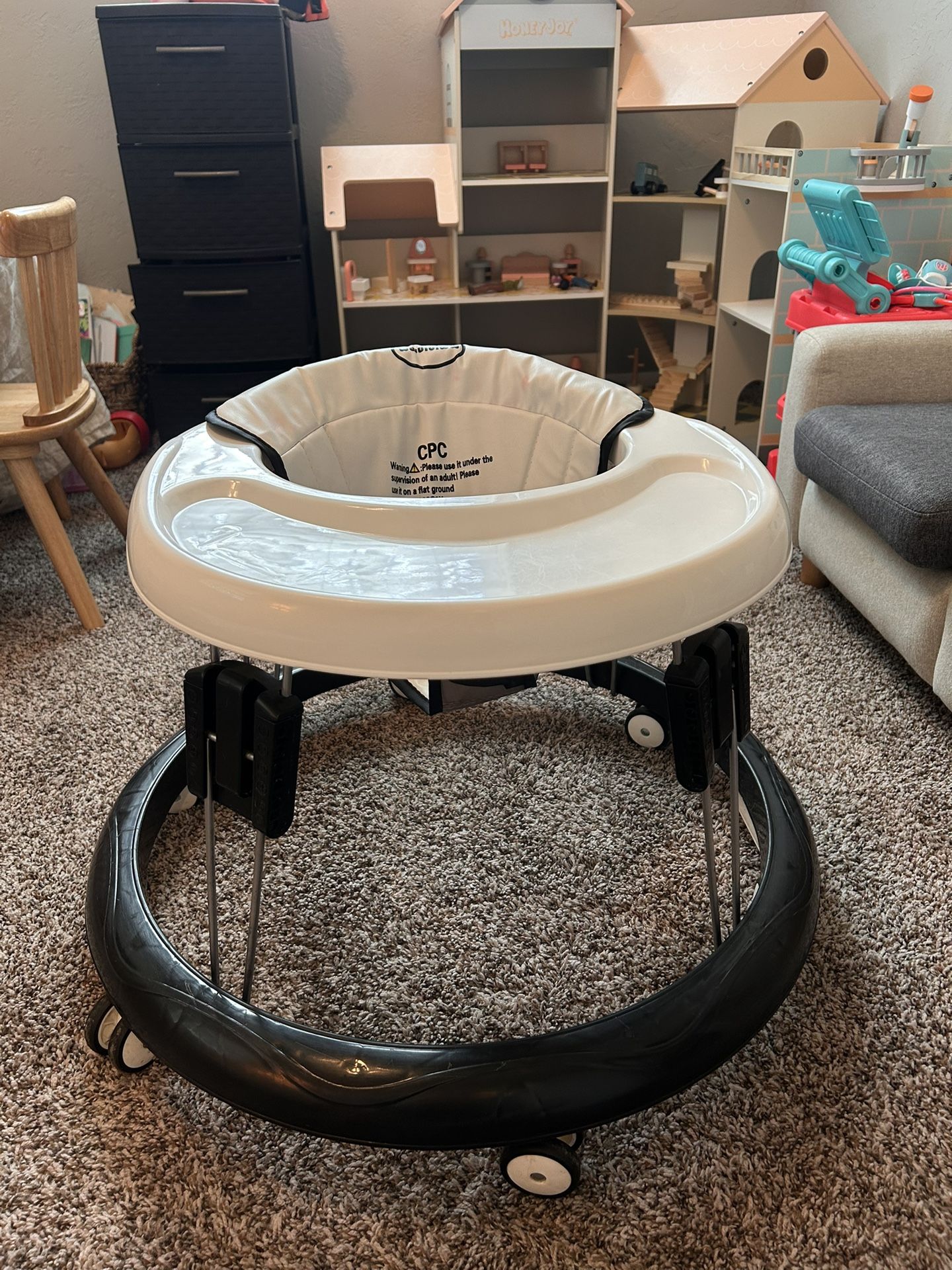 Walker collapses for storage and has locks for adjustable height. Trying to get rid of since our daughter is now 3.