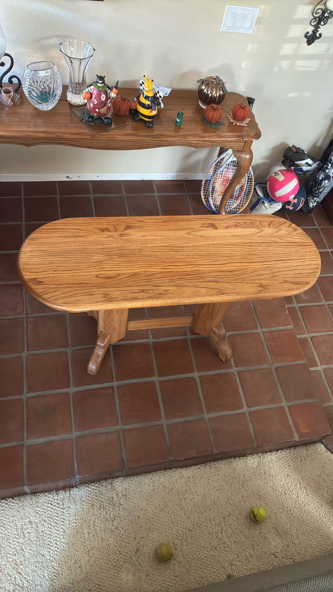 Classic solid oak table set includes matching entry table and coffee table. Entry table 17.5” w x 47.5” l x 27” h Coffee table 24.5” w x 48”l x 17”h $150 for both Must pick up Cash only