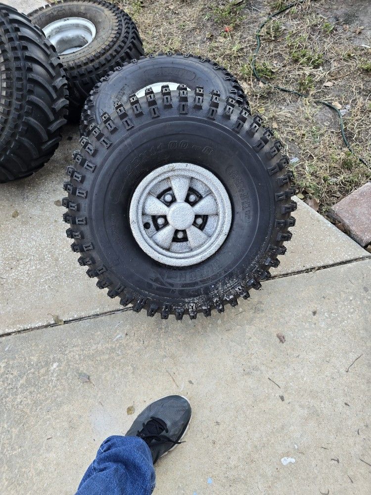 4 wheels and off road style tires. 22 x 10 x 8 taken off of a club car. Includes 4 wheels and tires 2 tires next to new other 2 have lots of tread. 4 hub caps and lug nuts.