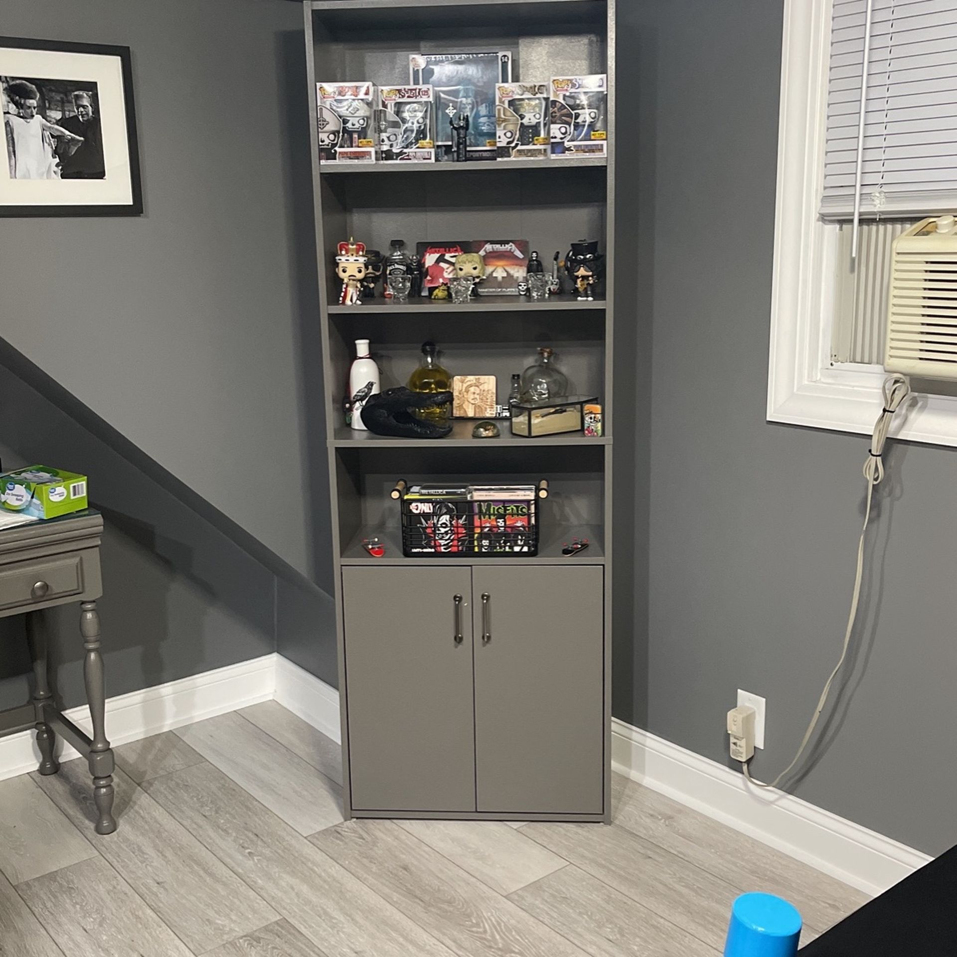 Stands about 6ft, 4 shelves as well as two bottom shelves for storage, originally white, painted gray, just needs a new paint job.