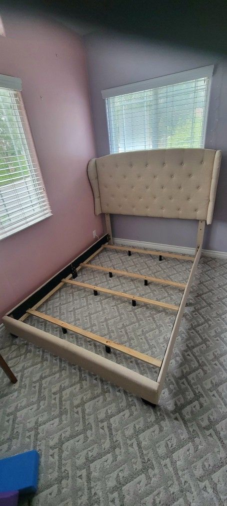 Tufted upholstered low profile bed Size - Full Color - beige Dimensions - 63" W, 79" L, 53" H Great deal. Reasonable offers only. Yes, it is available as long as the post is up.