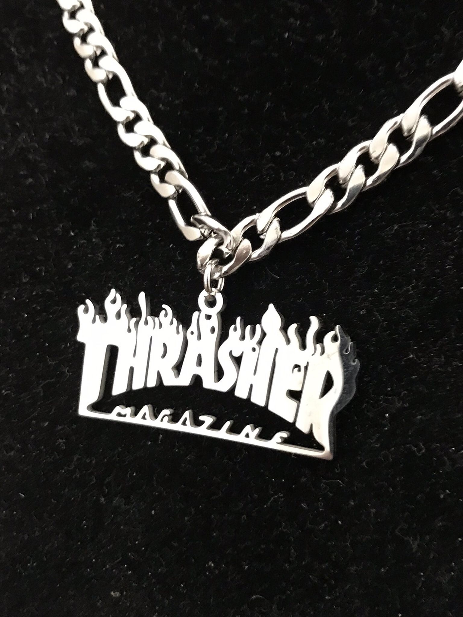 New, never worn. The Figaro style chain necklace is 18 inches. But if you want a different size, just text us for details. Free alterations up to 18 inch. Anything over 18 inches will cost a little more. The Thrasher Pendant is polished steel alloy. This item comes with an Organza Gift Bag. Come check out our page and follow us for more jewelry, With more than 150 five star ratings in just a few short months, We hope to make your purchase a 5 Star experience as well! The Pretty, Cheap and Charm Company