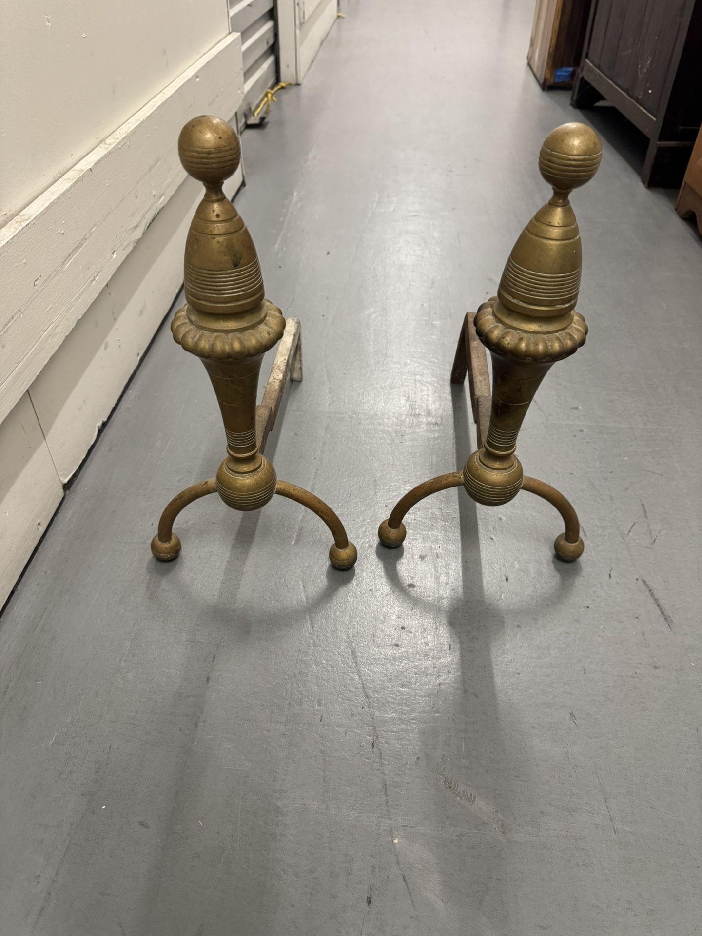 Late 18th century double lemon drop andirons. Brass made in the federalist style.