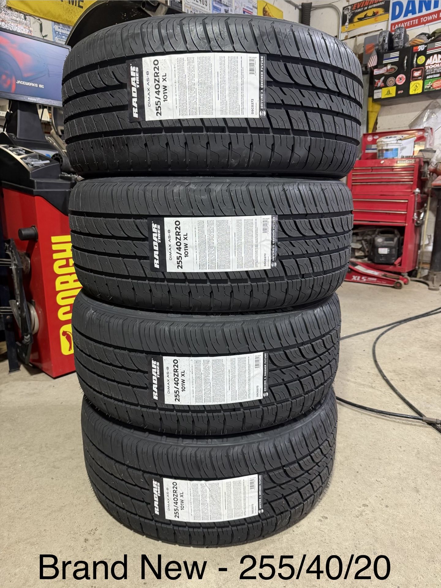 (4) - 255/40/20 Radar Dimax AS-8 Cards accepted with 2.8% merchant fee Condition - Brand new, never mounted. All season tires 50,000 mile rated tires Installation is $25 per tire plus tax. $5.00 per tire to recycle the old tires Lifetime flat repairs included WITH the purchase of mounting and balancing. Does not apply for cash and carry sales Price is FIRM, NOT accepting offers. Not interested in trades. Other sizes and brands available, let me know if you’d like a quote. Thanks for looking!
