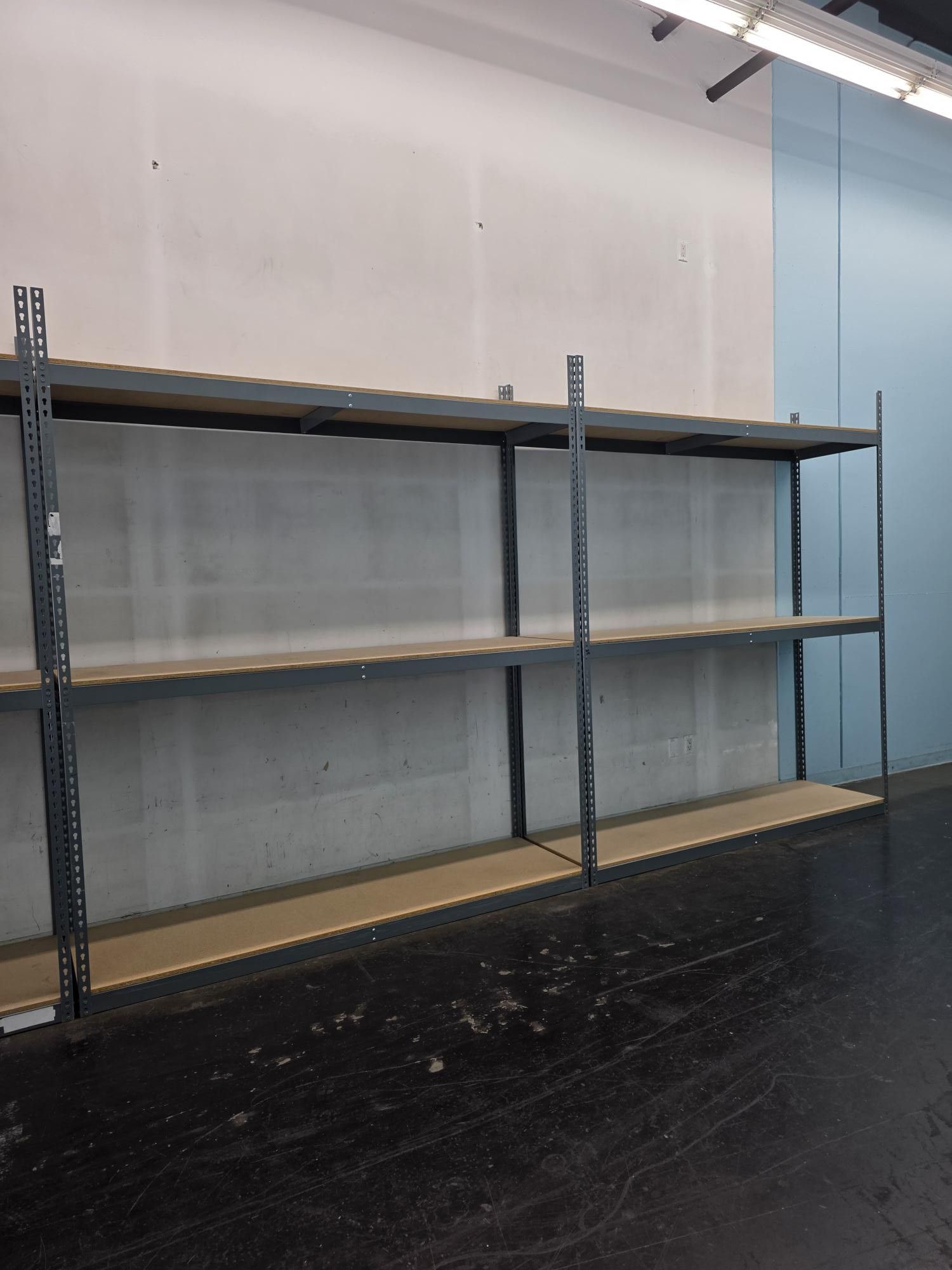 Used Industrial quality shelving 84 in W x 24 in D x 96 in H with 3 tier shelf levels including 1 center support per shelf level. Ready for pickup. Delivery and assembly available. Additional shelf levels and sizes available. 3 level units are $190.00 each.