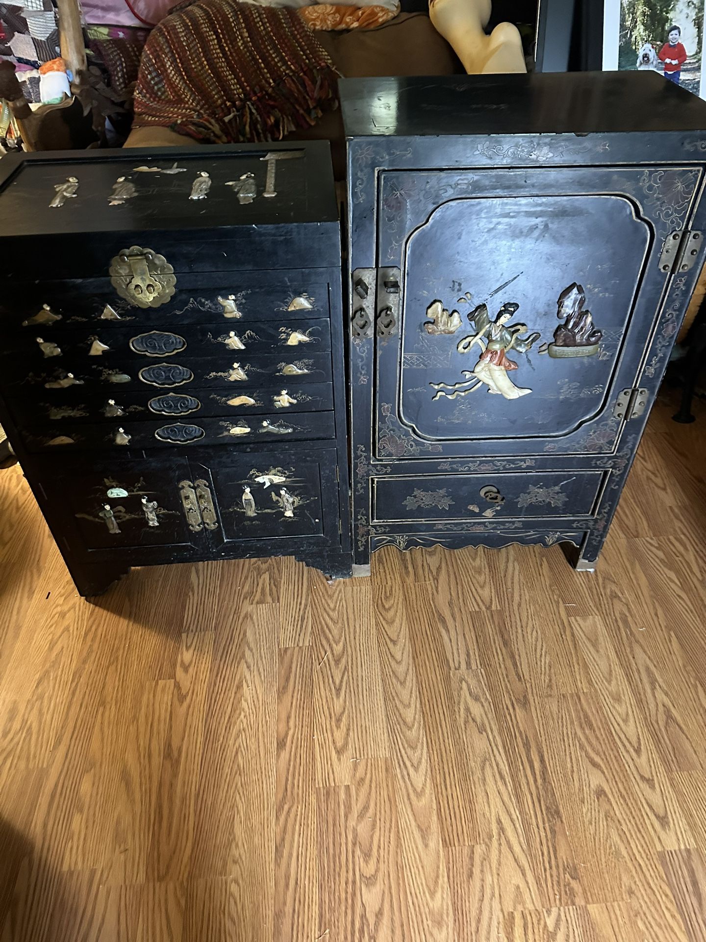 This is what grandma had beautiful vintage jewelry box in cabinet in excellent condition. The detail on it’s great don’t miss his Jem It’s Pick Up only and all sales are final.