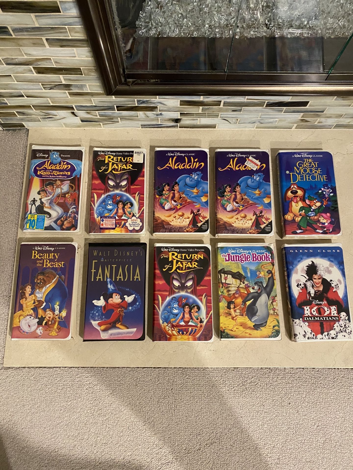 1. Beauty and the Beast VHS 1325, black diamond 2. 101 dalmatians, VHS 8996 3. Aladdin, VHS1662 black diamond. 4. Aladdin, VHS1662 black diamond. 5. Jungle book, VHS 1122, black diamond. 6. Fantasia, VHS, 1132. 7. The great mouse Detective. VHS 1360 black diamond. 8. The return of Jafar, VHS 2237. 9. Aladdin and the king of thieves. VHS 4609 sealed. 10. The return of Jafar, VHS 2237 sealed Please contact me with any questions 2 are like new, sealed still The rest range from good to like new condition