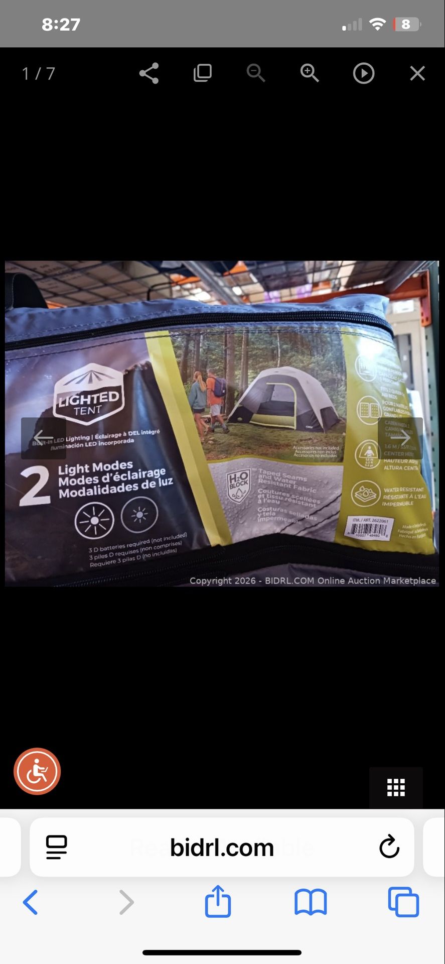 Awesome CORE Equipment 6 person lighted dome tent. Has built-in LED lighting with 2 light modes. Water resistant fabric and taped seams for H2O Block. Measures 10 ft x 9 ft with 5.5 ft center height. Needs 3 D batteries, not included.