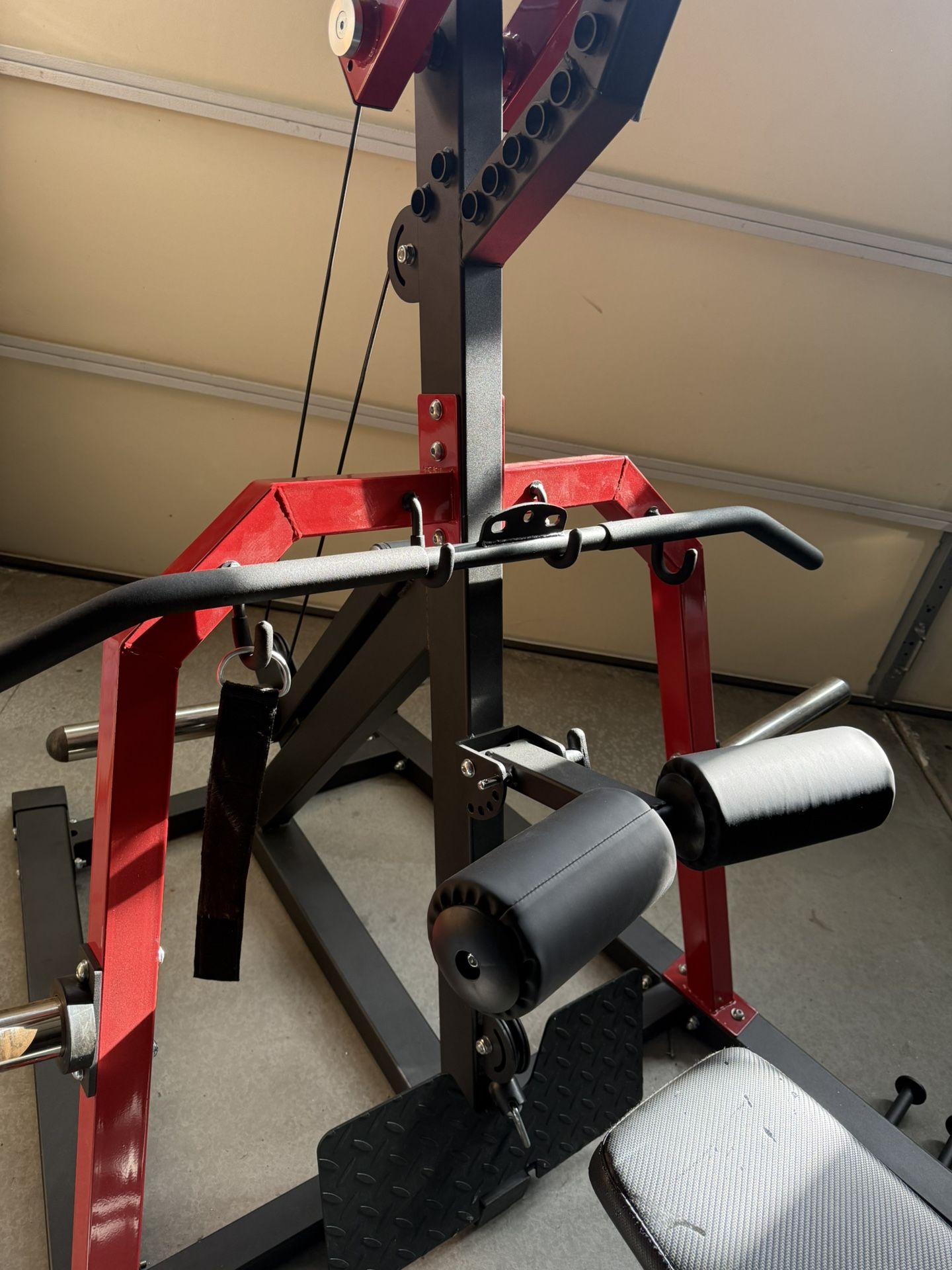 Levergym. Plate loaded , pulley system. Normal use. Comes with bench , pull down bar and curl bar