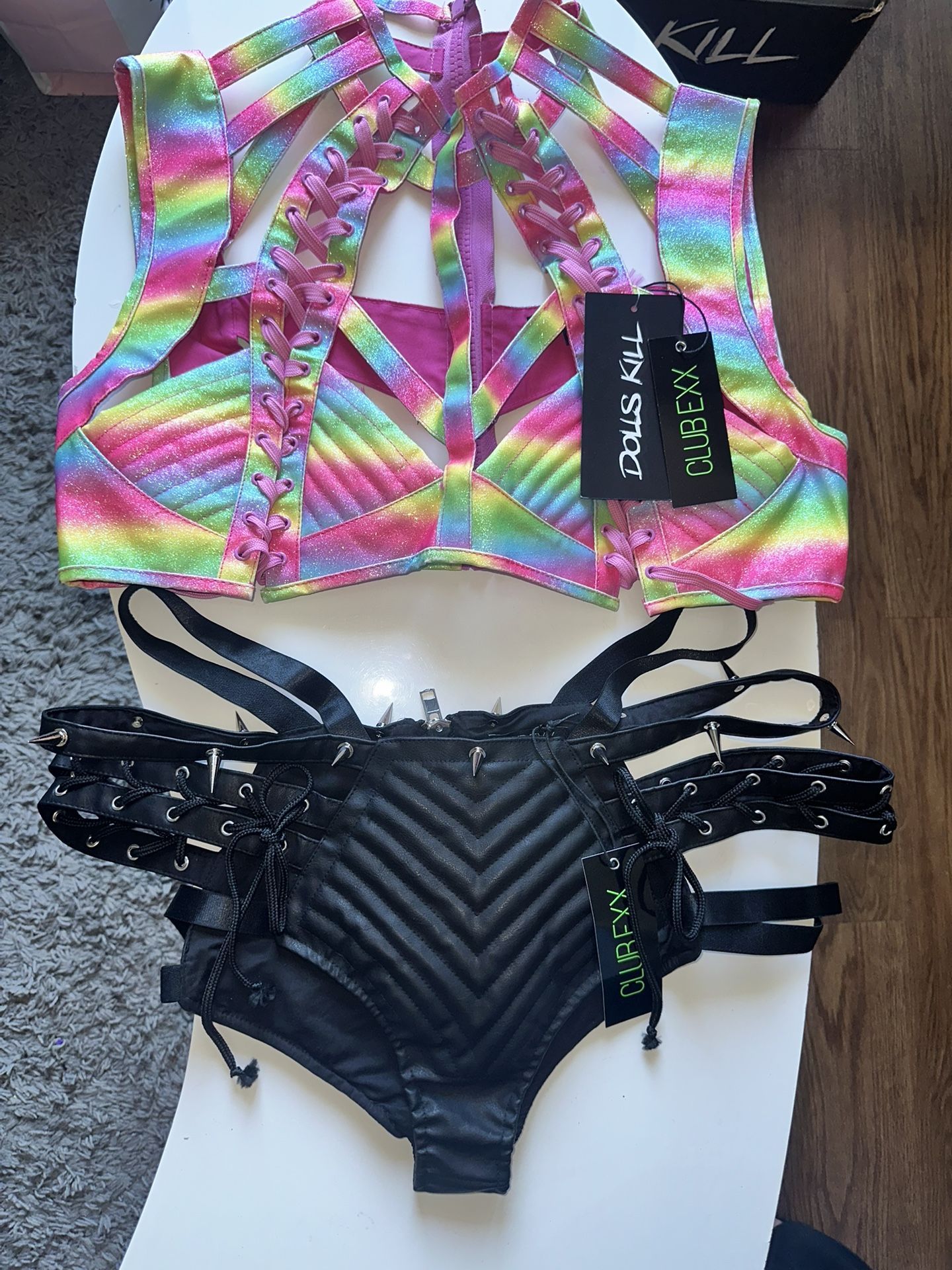 Rave Set Rainbow Top And Black Spiked Bottoms Size XXL Brand New with tags from Dolls Kill. Perfect for EDC and other festivals! 🌈🖤✨check out my page for more items!