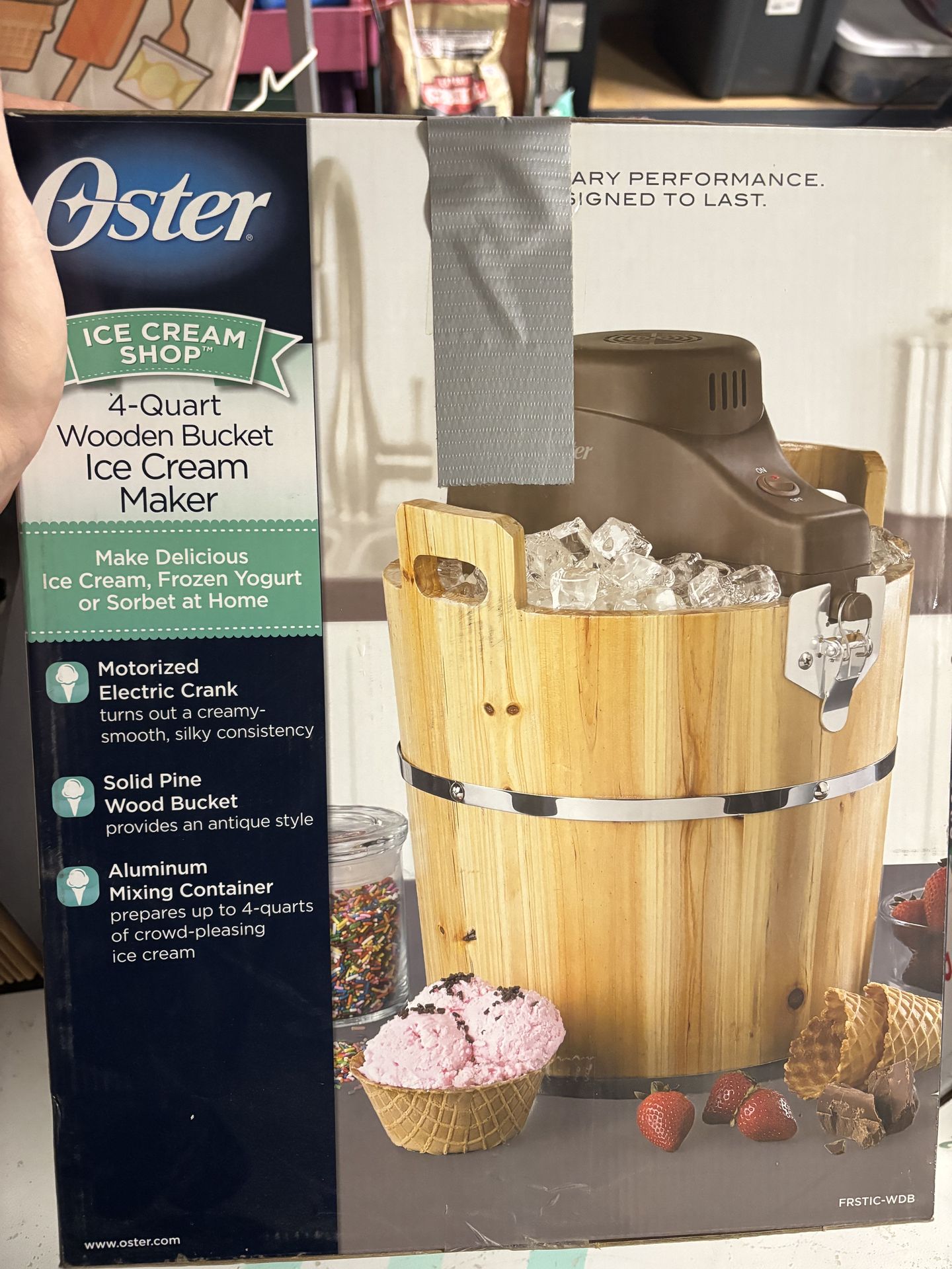 4 quart wooden ice cream maker with motorized electric crank. Never used, like new, open box.