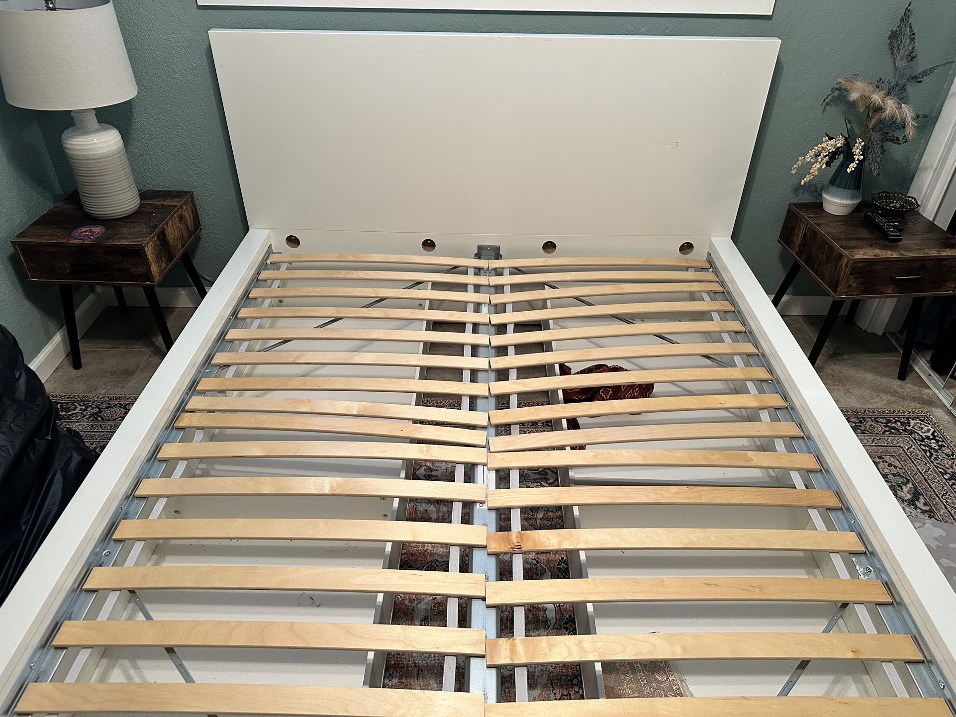 Ikea white bed frame queen. with 4 storage shelves. Minor issues including a dent on the bed frame, and wheels broken on 1 shelf underneath.