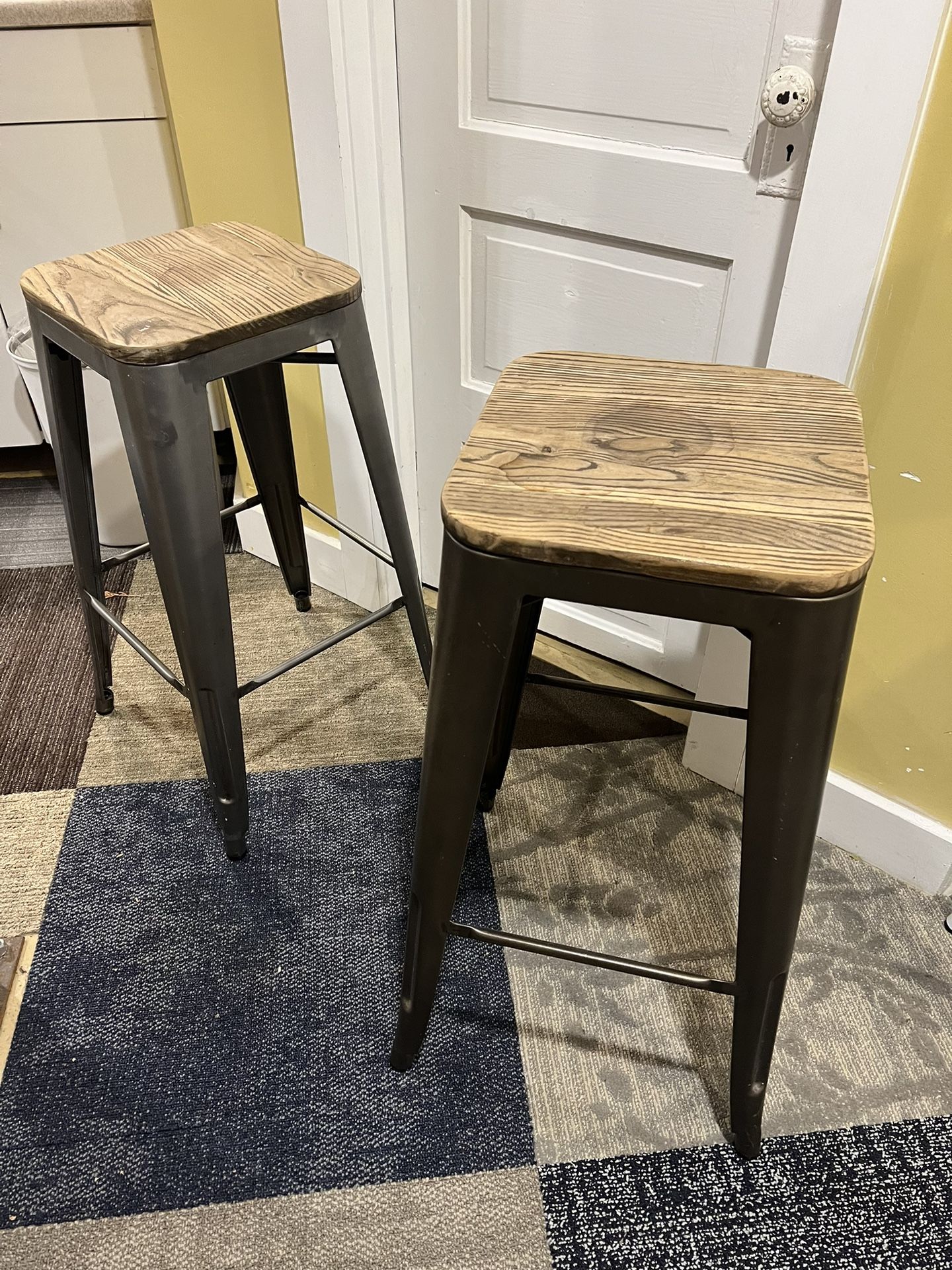 Each stool is 30” tall. They are stackable. Dark grey metal, wooden seats. Solid.