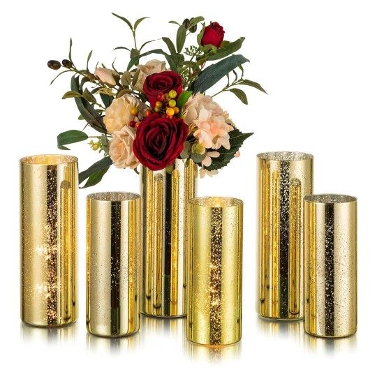 6 Modern Cylinder Vases for Centerpieces, Gold Glitter