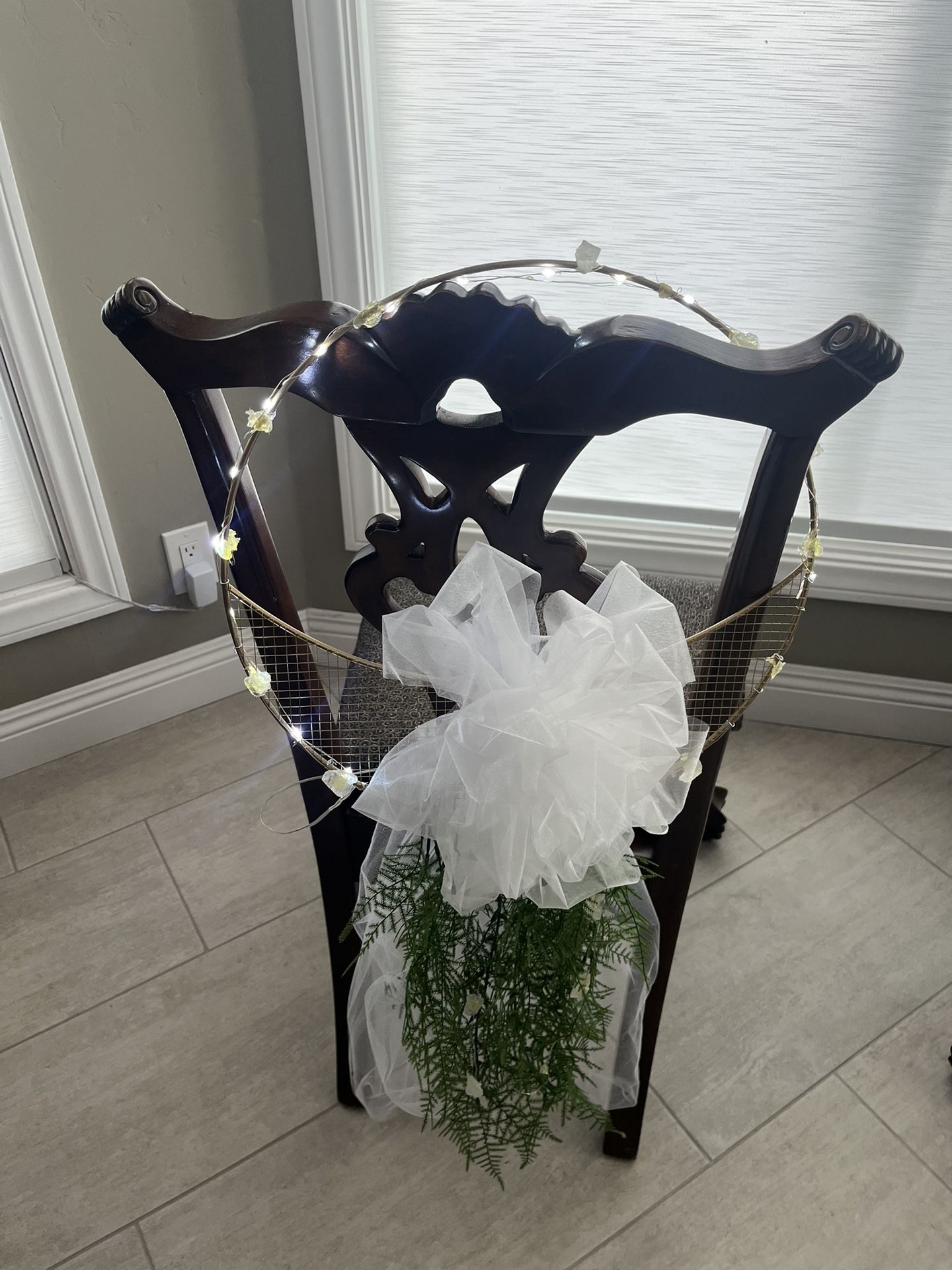 24 beautiful custom made asile /chair arrangements. Ready to hang & light up. Gold half moon metal frame attached with Himalayan rocks & miniature lights, white long bow with tule & greenery. Everything is removable. Great for weddings, quince, quinceañera, parties, etc. *Accepting offers on everything! *wedding, wedding decor, quince, quinceañera, party decor, asile decor