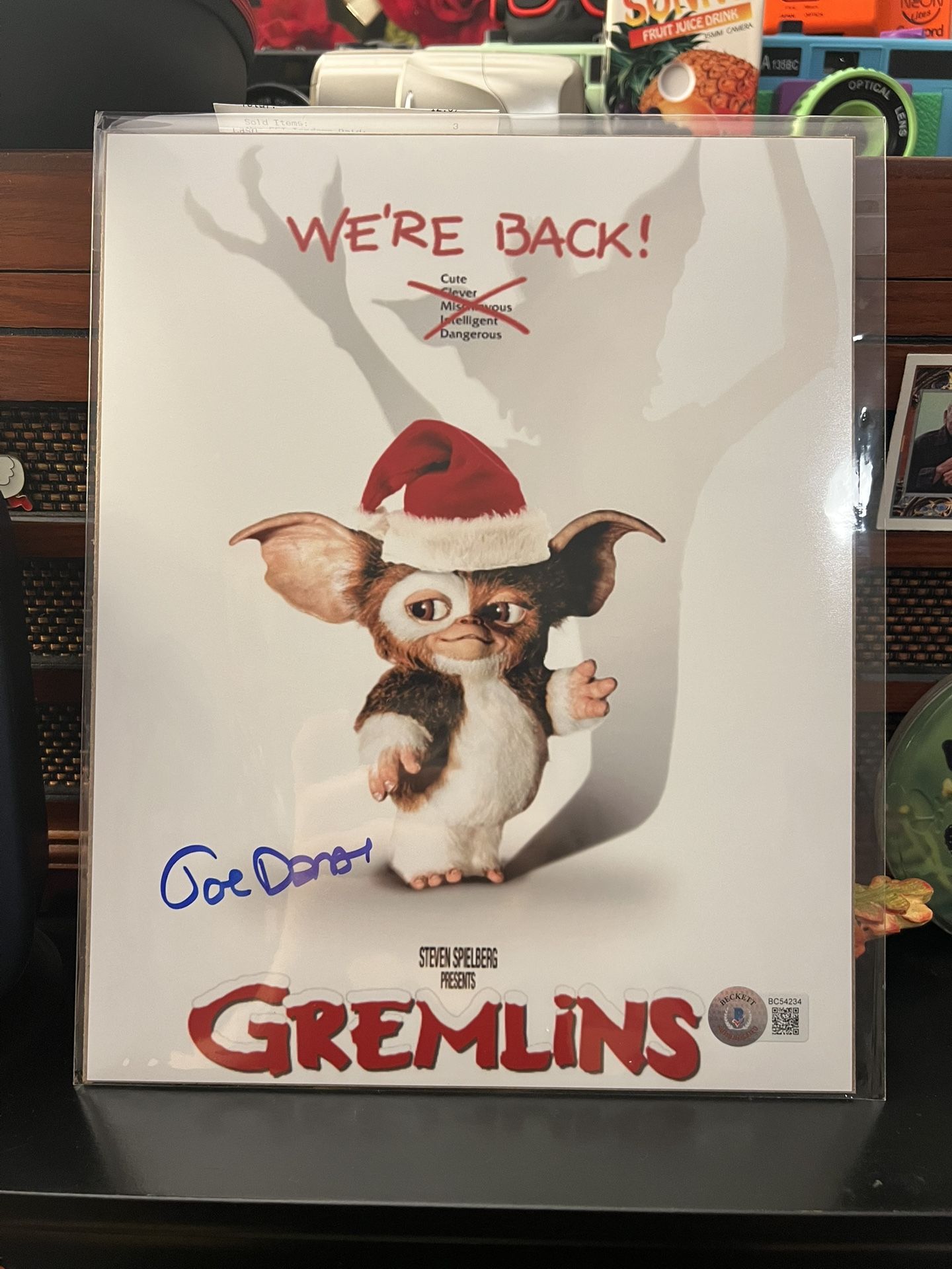 New in protective sleeve and cardboard backing Gremlins movie poster 8x10 signed by the director Joe Dante, Beckett Authenticated Autograph