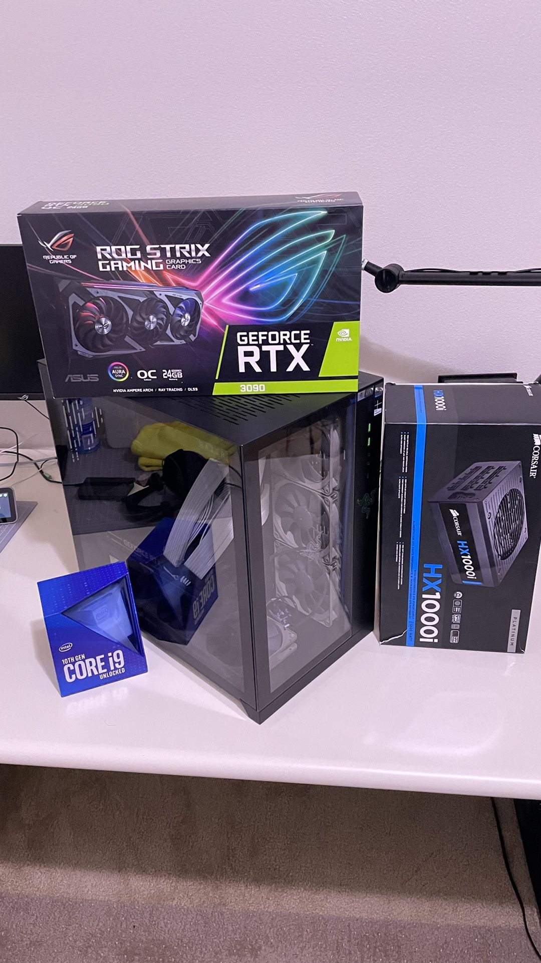 Mother Board - Asus Rog Strix Z490-E gaming intel i-9 10900k 10 core Nvidia ASUS Rog strix 3090 OC edition 24GB Corsair 1000W platinum PSU NZXT Kraken AIO z73 6 Noctua Fans beige Lian Li dynamic Razer edition case 1 tb Samsung Nvme 970 evo plus 2 tb Samsung Nvme 980 pro 1 tb Samsung ssd qvo 870 Lian li stripper LED mother board and GPU cables Corsair(BLK) dominator 64 gb ddr4 3200hz