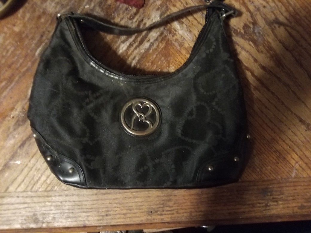 Black with designs on it and sliver metal accents, double together heart shaped and little round cycles, short shoulder strap, all zippers work, pre-owned but never used