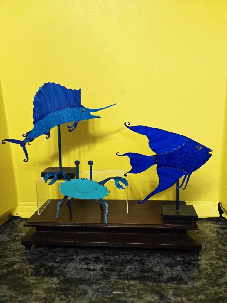 Metal Blue Tropical Fish, Crab Sculptures Sighned by Artist CLAUDINE BUELL 9.5", 8.5", 6"