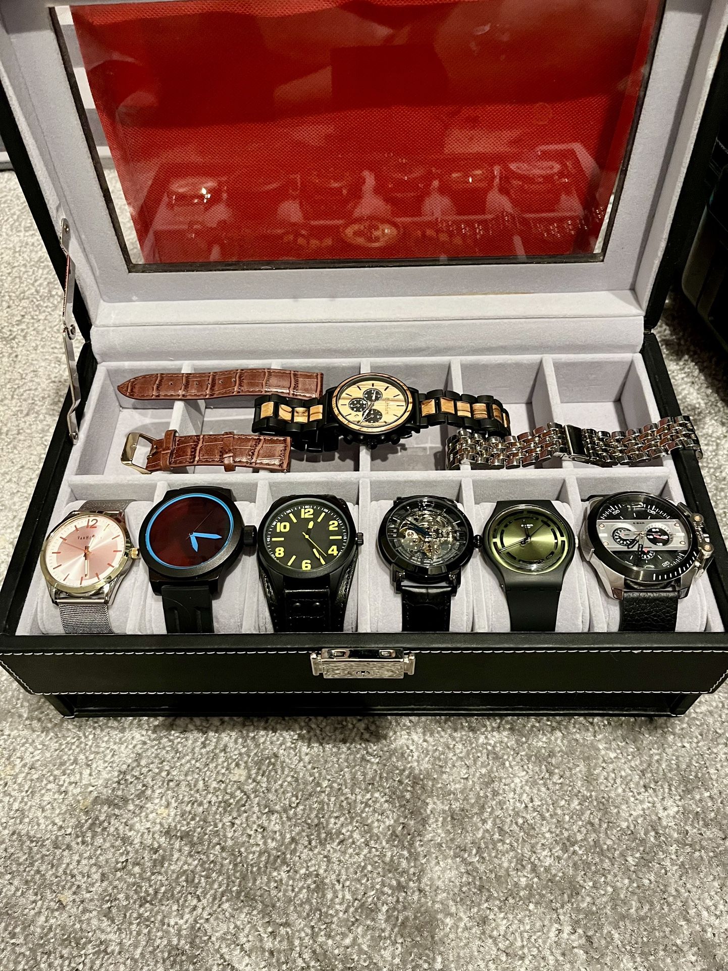 Selling 6 watches. I will throw in an original grain watch and two watch straps for free. With purchase of the set. Here are the following watches from left to right. - Van Heusen $20 - Kenneth Cole $40 - Aeropostale $10 - Stuhrling Automatic Skeleton $105 - Swatch Live Leaf $70 - Diesel Chronograph $115 Or $350 for whole set All the watches are in like new condition and have very little to hardly any use on them. Please note, the free original grain watch needs a battery.