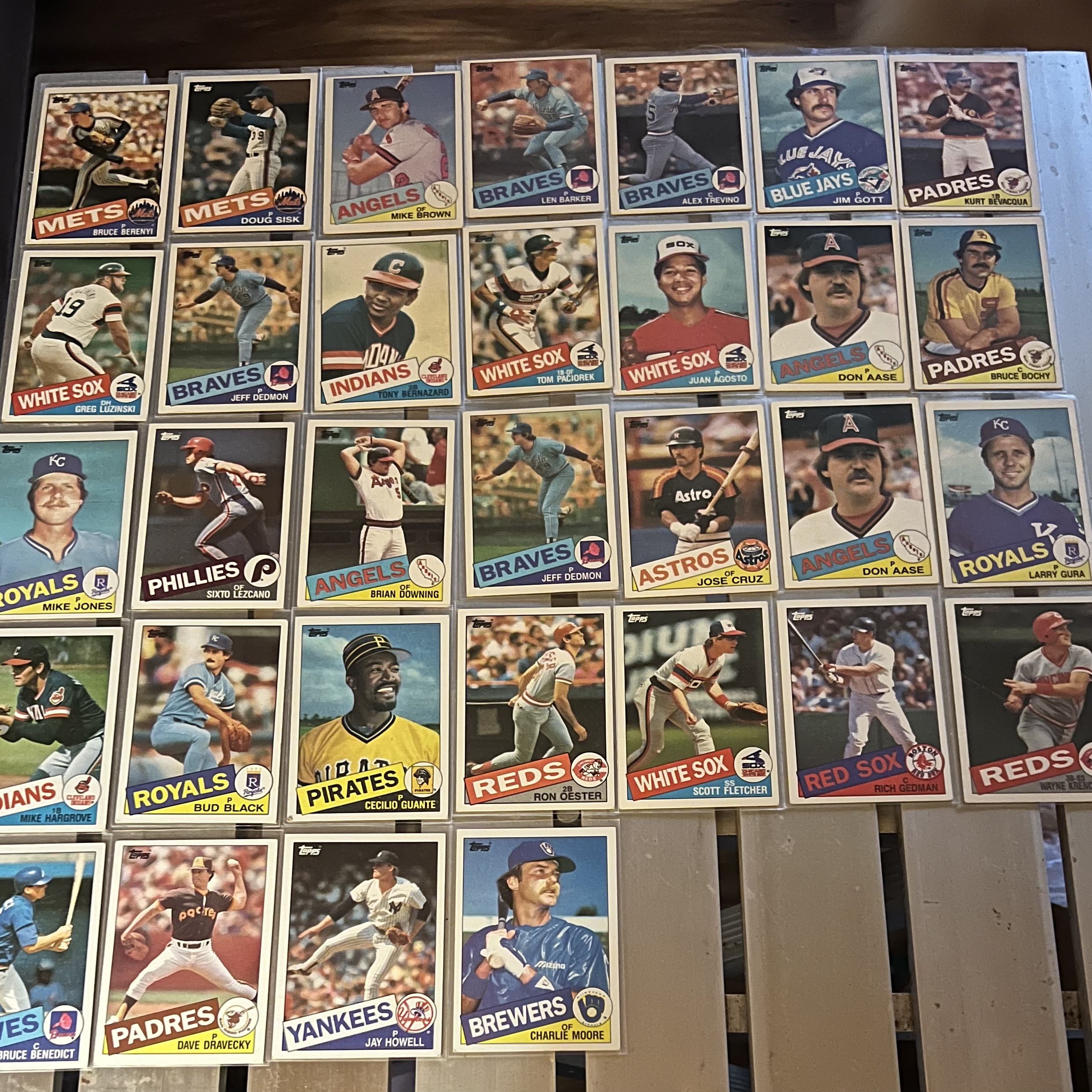 Collection of 1985 Topps baseball cards featuring players from various MLB teams including White Sox, Braves, Padres, Pirates, Royals, and others.