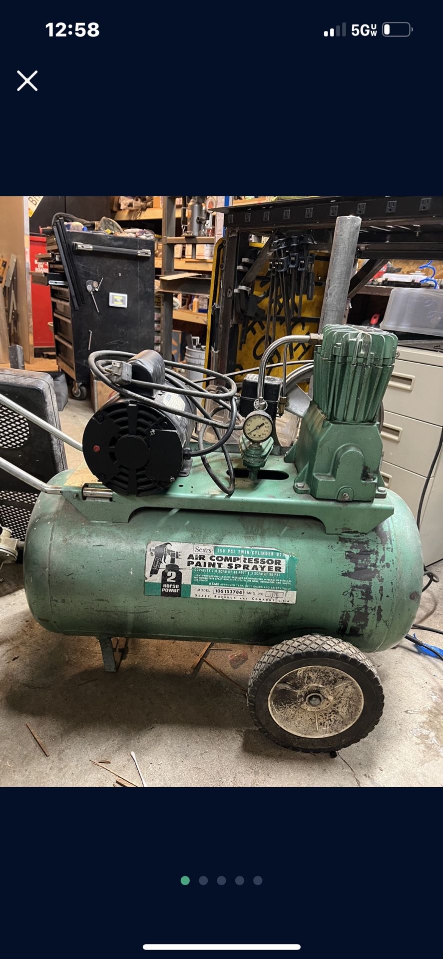 An oldie but a goodie. Mechanically well maintained. Mainly used to air up tires. Have painted several vehicles with this compressor and it keeps up just fine. Pros: 7.8cfm is great for hvlp painting 2hp Leeson motor has brand new bearings, compressor seals in great condition,zero rust inside tank, no leaks of any kind, wheels roll smooth. Cons: Paint, minor surface blemishes, 220v (but $470) Leeson motor doesn’t make it the most versatile machine in the world.
