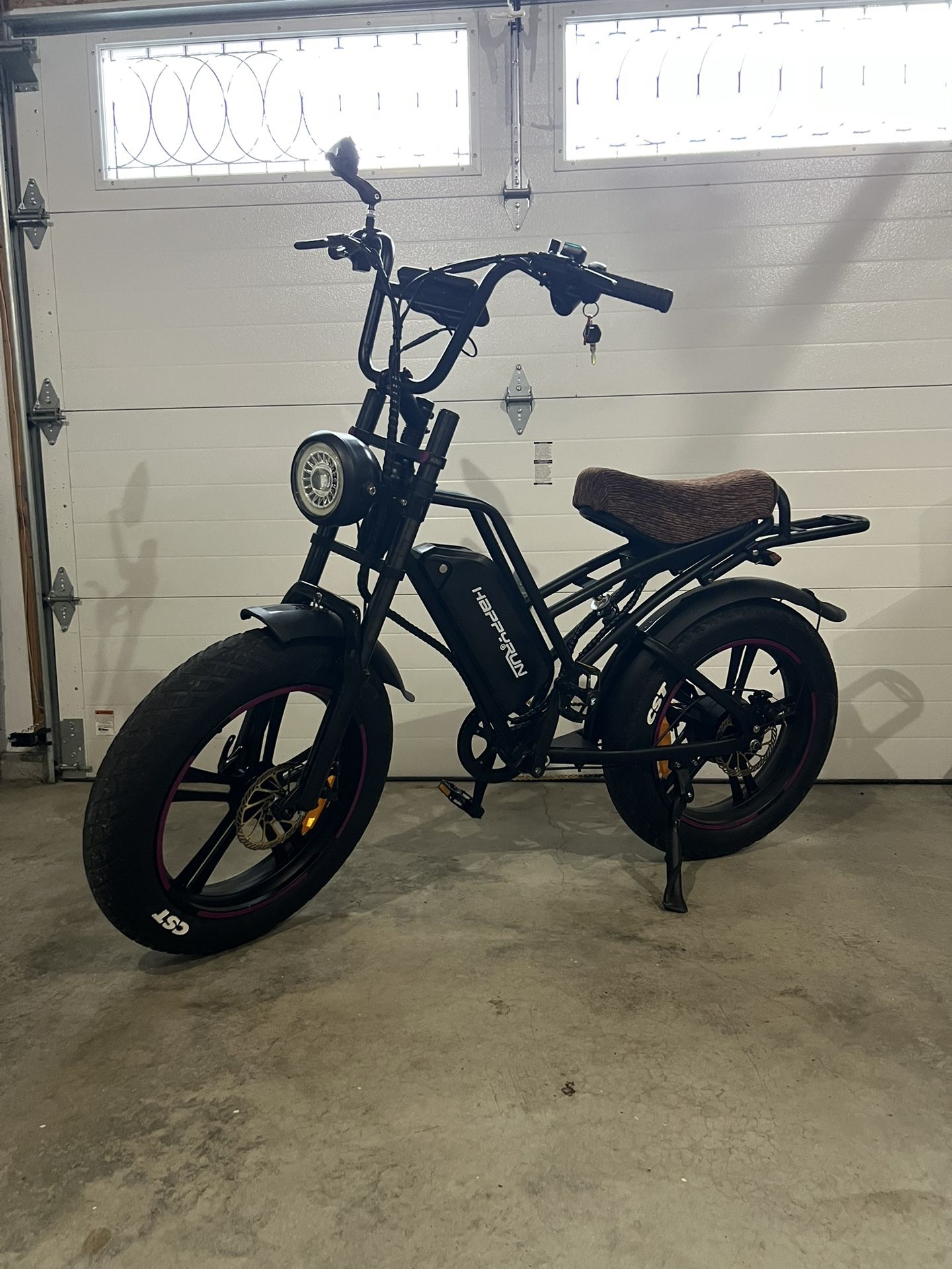 Happyrun G50 e-bike 48v battery 500w motor Rear rack option New disk brakes and pads Upgraded front spring fork Custom recovered seat Lowered with shorter rear shock Big boat 20x4 tires Single speed conversion with chain tensioner New chain Low miles Charger and all keys included