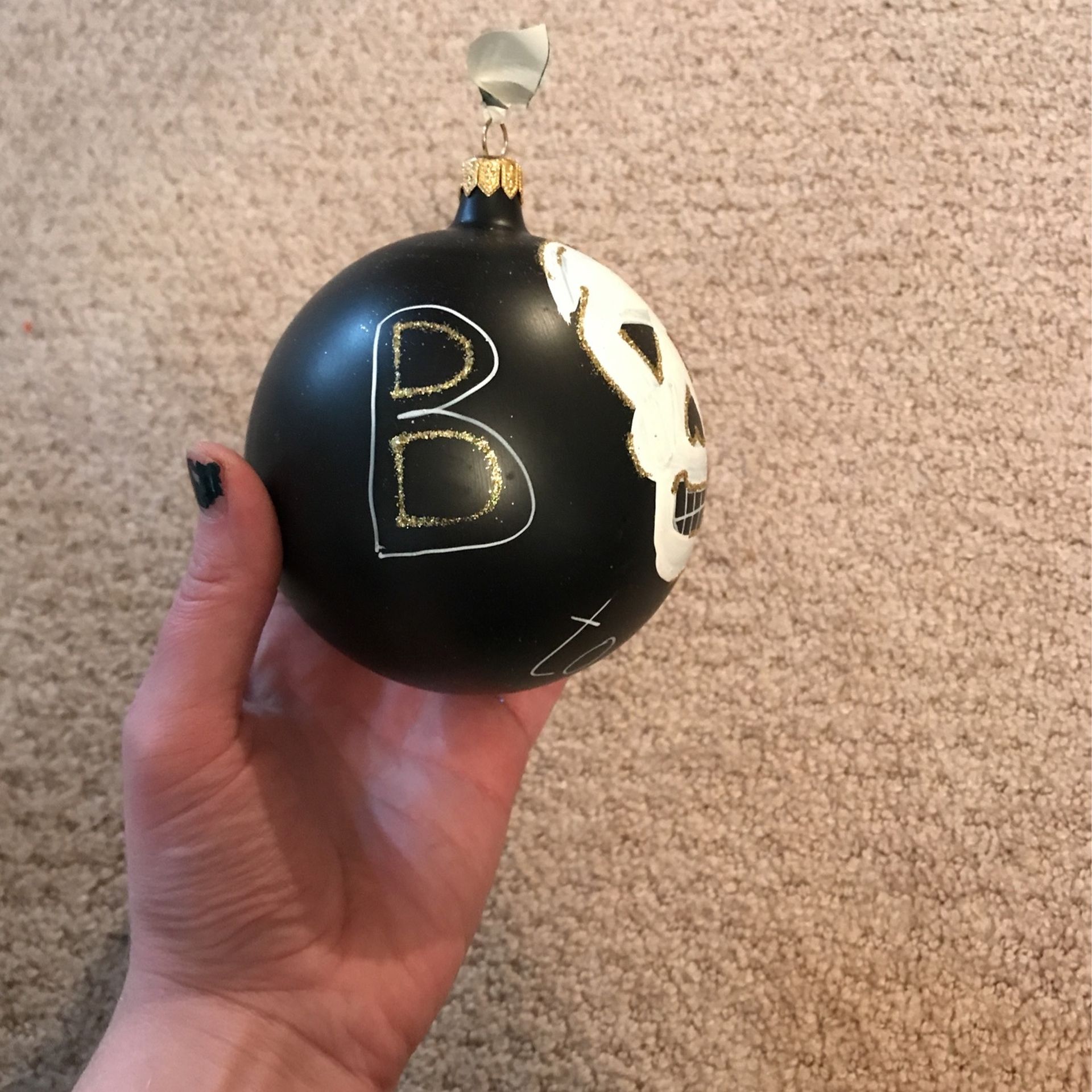 Hand painted ornament that says Boo with a skull.