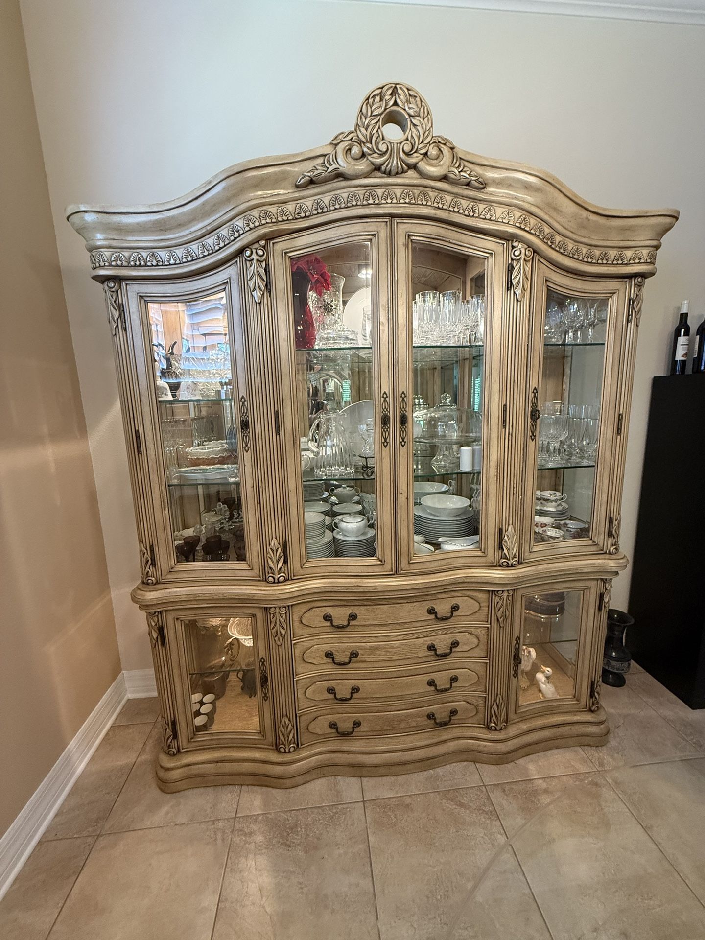 Amazing quality! China cabinet is 73” wide and 90” tall with 4 doors on top with beveled glass and the bottom has 2 glass front doors and 4 drawers. Touch lighting also. The sideboard has an attached mirror with a carved wood frame, 1 cabinet on either side, 1 double drawer, and 1 single drawer. 54” wide and 79” tall, including the mirror. This set is high-quality, very heavy and about 20 years old with very little use. Set was $5,500 new.