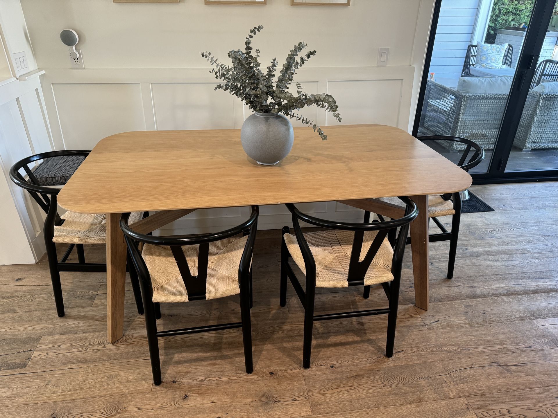 Article kitchen table with 6 wishbone chairs. Only 3 years old, table has some dings but very superficial. Very solid build, table brand new was $799 , chairs were $145 each.